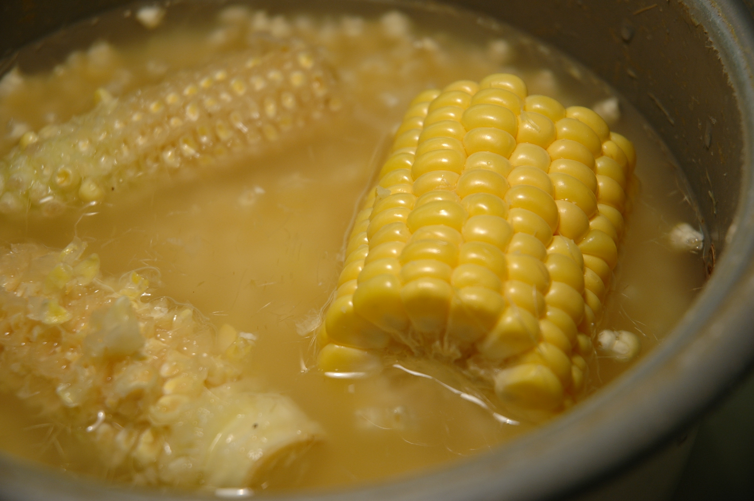 使う材料も、玄米3合とそれにみあう適量の水、皮・ひげをむいて芯はつけたままのとうもろこし・1本、塩・適量と、きわめてシンプルです。作り方は、玄米を炊くように準備したら、とうもろこしを丸ごと1本(写真は、とうもろこしが長すぎてはいらなかったので、きりました。)放り込んで、通常通り炊くだけ。炊けたら、とうもろこしから、実を芯からはずして、ご飯に混ぜます。