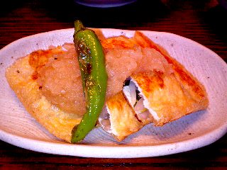 おから納豆を油揚げの中につめて、オーブントースターで焼く。ポン酢をかけていただく。