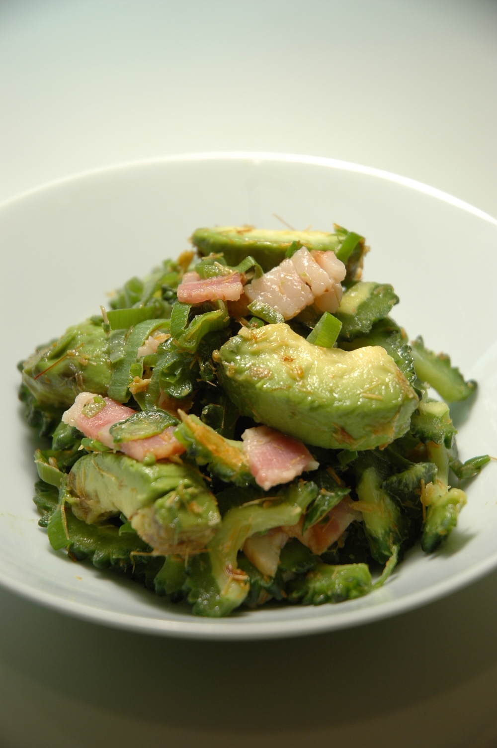 みなみさんのレシピは、ゴーヤのほかに、にんにく、ネギ、ベーコン、そして、のこった桜海老を粉にしたものを使って、1品にしています。濃厚なアボカドと、旨みたっぷりの材料で、ゴーヤが苦手な人も美味しく食べられるのではないかと、思いました。桜海老っていうのが、新鮮ですよね。どんなんだろう〜