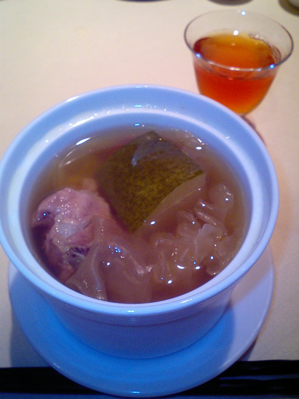 写真の料理は、コースの一品の『豚のスペアリブと大豆の蒸しスープ』