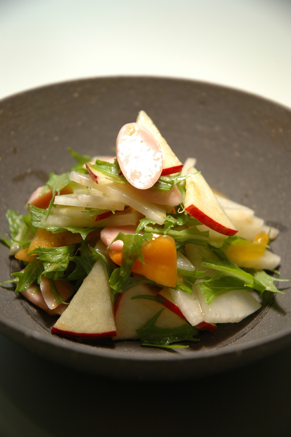 料理に紛れ込まして、協力してもらおうと作ったのが、『柿とだいこんのマリネ』です。コレは、デパ地下の柿安ダイニングの、秋のお惣菜、『柿と白カブのマリネ』をまねたものです。柿安さんバージョンで使っていたものは、ブロッコリー、カブ、リンゴ、柿、ローストした胡桃を柚子風味のドレッシングであえたような感じでした。カブの代わりに大根を、ブロッコリーの代わりに水菜を使って(家にあったので)作りました。柚子の風味と柿やりんごが、フルーティーなので、だいぶ、何とかなったんじゃないかと思います。残りも、もう一回、フルーツサラダに入れて、使い切って、もう買わないでおこうと思います。(笑)