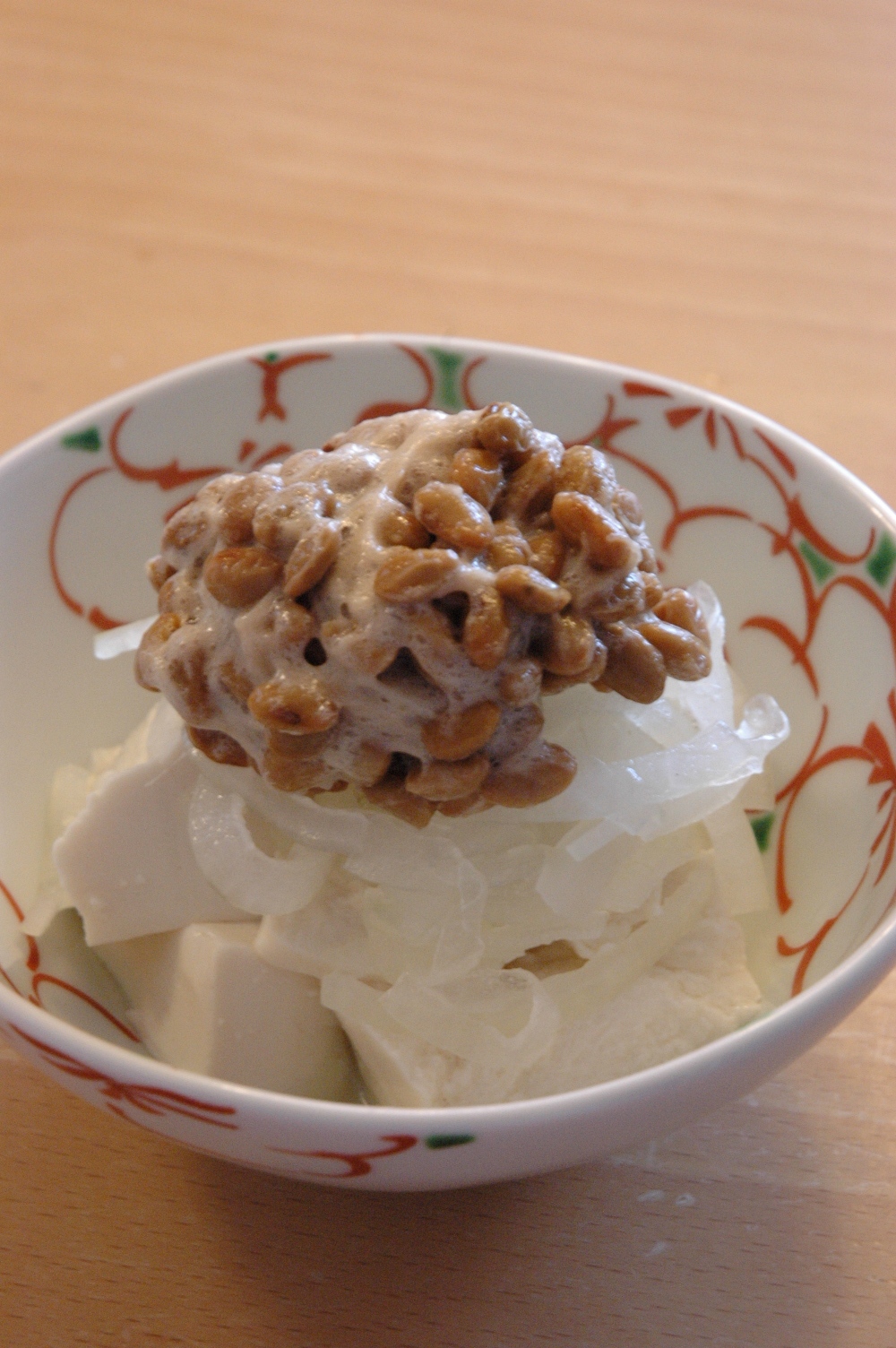 柔らかく淡白な豆腐とシャキシャキしてちょっと、辛味のあるスライスオニオン、粘りと旨みのある納豆って、どれも、めんつゆとの相性も抜群の食材。一度に、色んな食感を味わえると、変化に富んで、面白いし、簡単な割には、ヒットでした。
