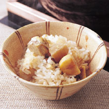 4 1の米の水けをきって土鍋に入れ、2、3を加えてふたをし、強火にかける。8〜10分間たってふきこぼれるくらいになったら、弱火にする。約12分間たったら15秒間ほど強火にしてから火を止め、そのまま15分間おいて蒸らす。