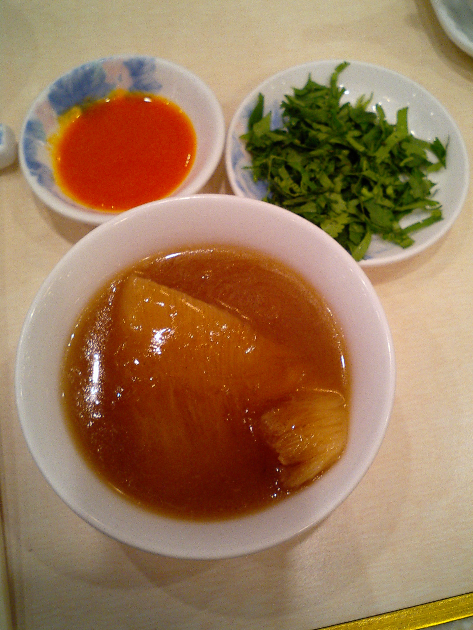 フカヒレの姿煮が出てきたときも、取り分けるレードルが、昭和時代のお玉のようで、あまり、高級店という感じがしなかったのですが、食べてみると、味はよかったです。味的には、満足で、来てよかったと思いました。フカヒレの姿煮と、肉厚のどんこ椎茸と鮑が入っています。スープは、とろっ〜
