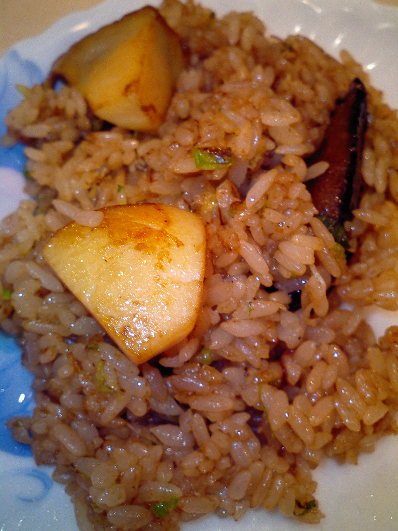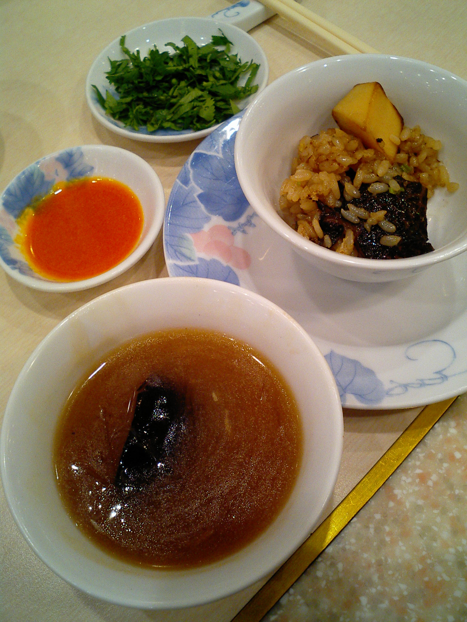 チャーハンは、一見したところ黒っぽいので、醤油味かと思いきや、複雑な味でした。色のわりに味は濃くなく、少しモチモチしておこわのような感じ。そして、鮑がゴロンとぶつ切りに大きくカットされて入っていて、ちょっと、ビックリでした。栗ご飯みたいですが、鮑なんですよ。^^こんなに大きいけど、柔らかくて、美味しい。