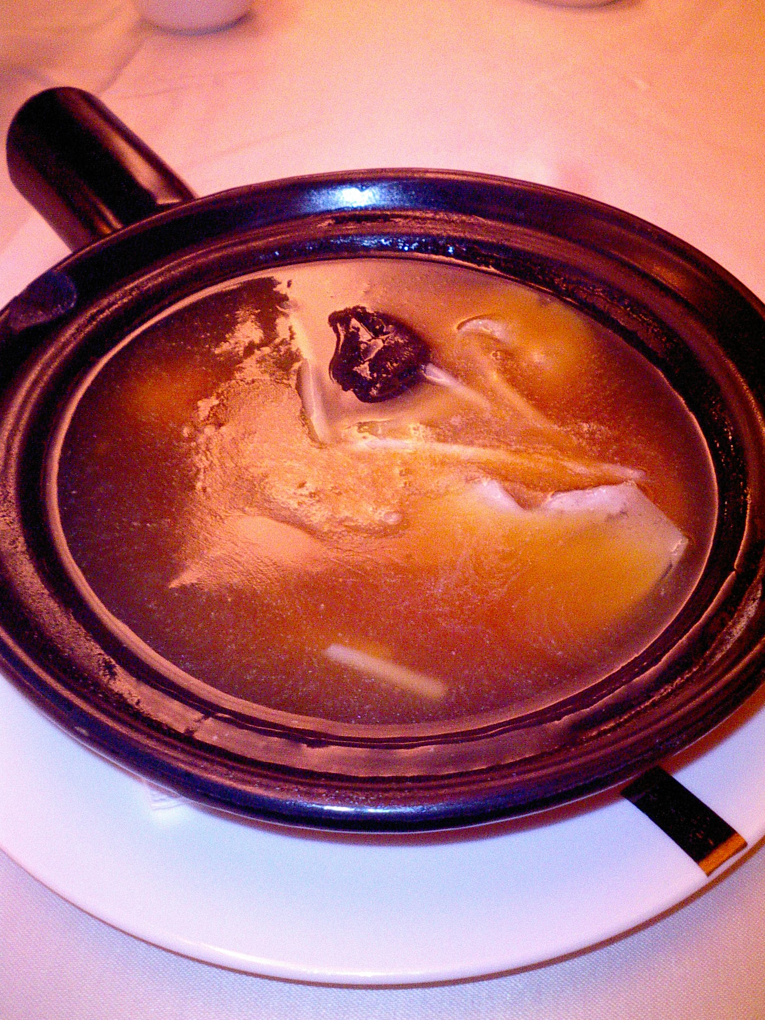 フカヒレは、立派な一枚の姿煮でした。(写真左の状態ででてきて、スープを飲んだら・・・→写真右・こんな立派なふかひれが出てきた様子です。繊維がしっかりしています。)添えられていた中国の赤酢をかけても、ひと味違った味と香りが楽しめました。海鮮・ふかひれの姿煮や煮込み料理に相性がよくて、とてもまろやかな味になります。