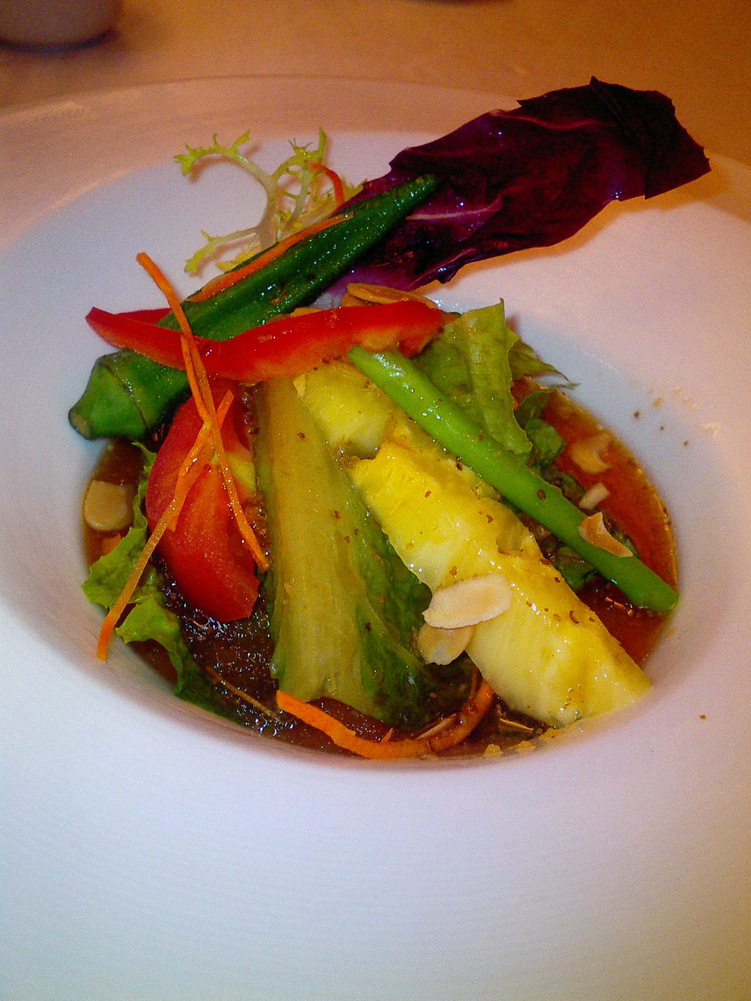 ココは、フカヒレをガッツリ食べるというより、コースで、サラダ(サラダのドレッシングは、しょうゆベースですが、野菜に混じって、パイナップルがはいっていたんです。でも、意外と、しょうゆドレッシングとの相性もよくって、美味しかったです。ちょっと、ユニークでした。)、鮑、