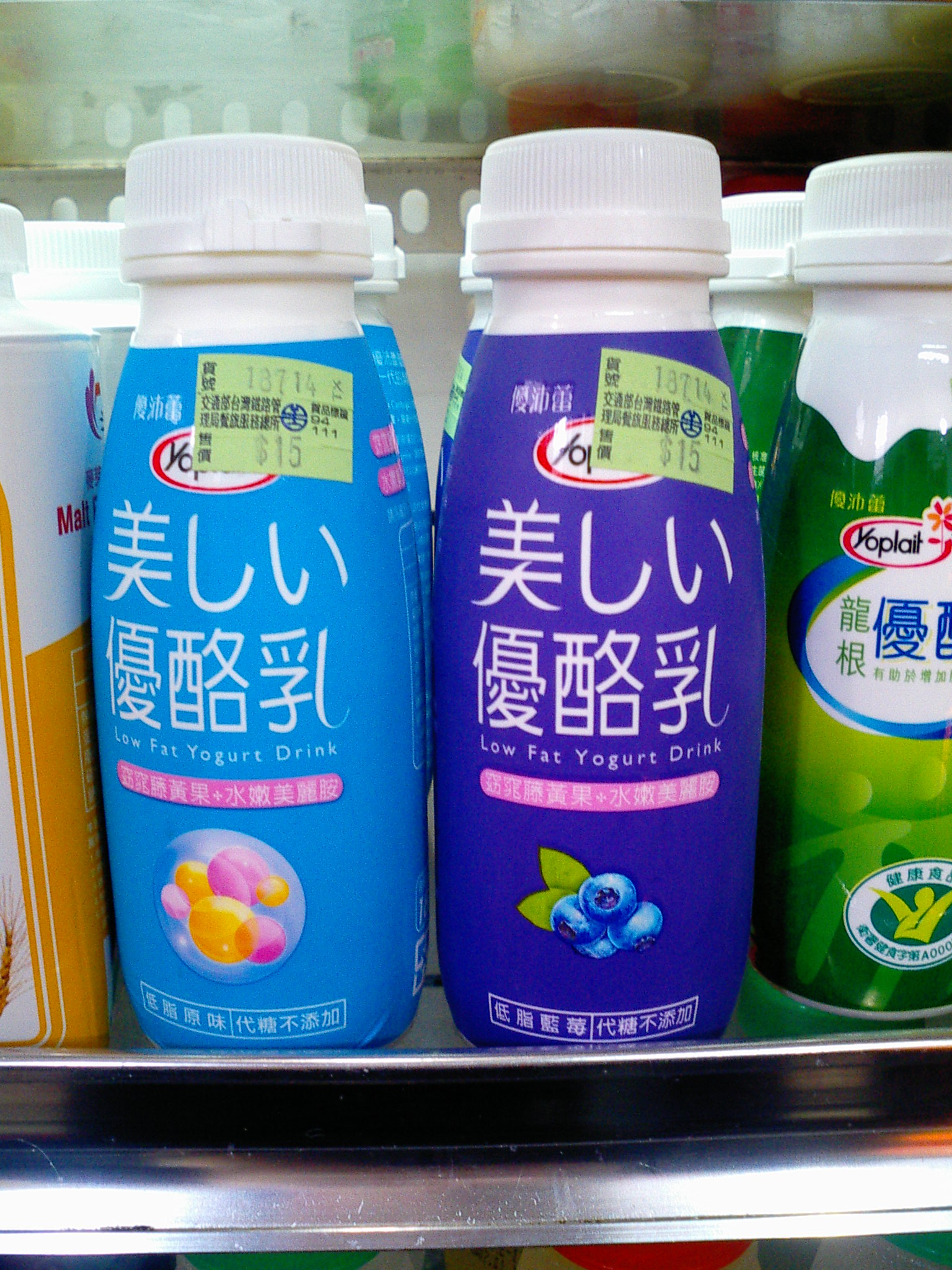 ちょっと、面白かったのは、美しいあしたの台湾バージョンがあったこと。佐伯チズさんの写真はなかったけど、やぱり、ちゃんと、コラーゲン入りでしたよ。また、人工甘味料不使用とか書かれてヘルシーな感じをアピールしていました。プレーンと、ブルーベリー味がありました。
