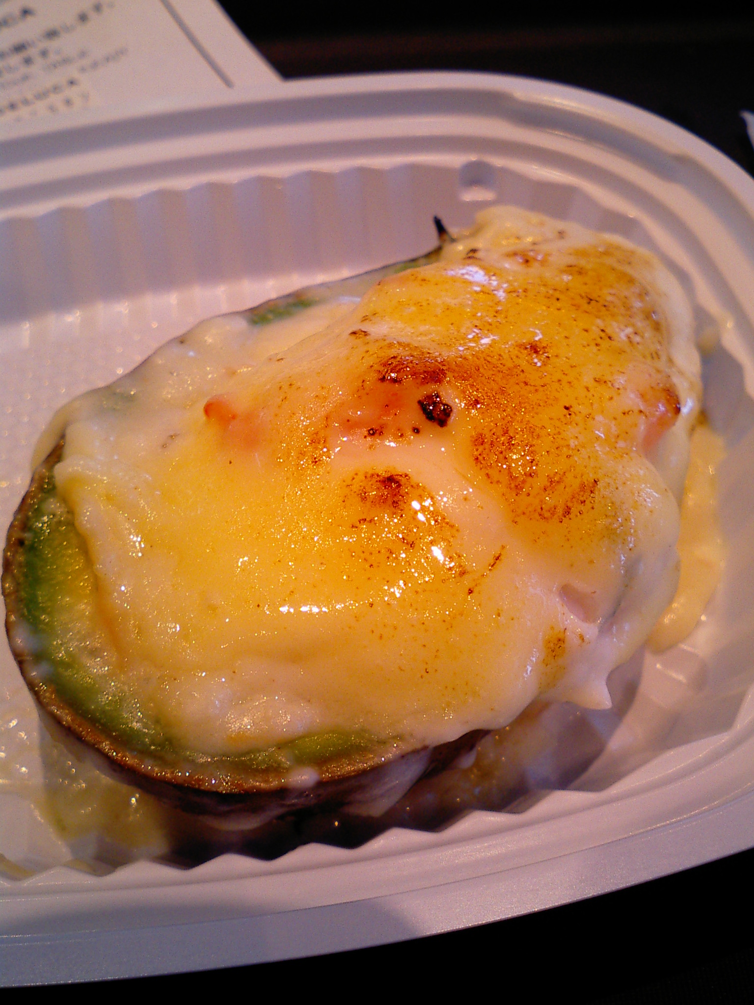 アボカドを半分に切って、種を除き、ぷりぷりした大ぶりの海老と、ホワイトソース、チーズがたっぷりこぼれんばかりにのっていました。