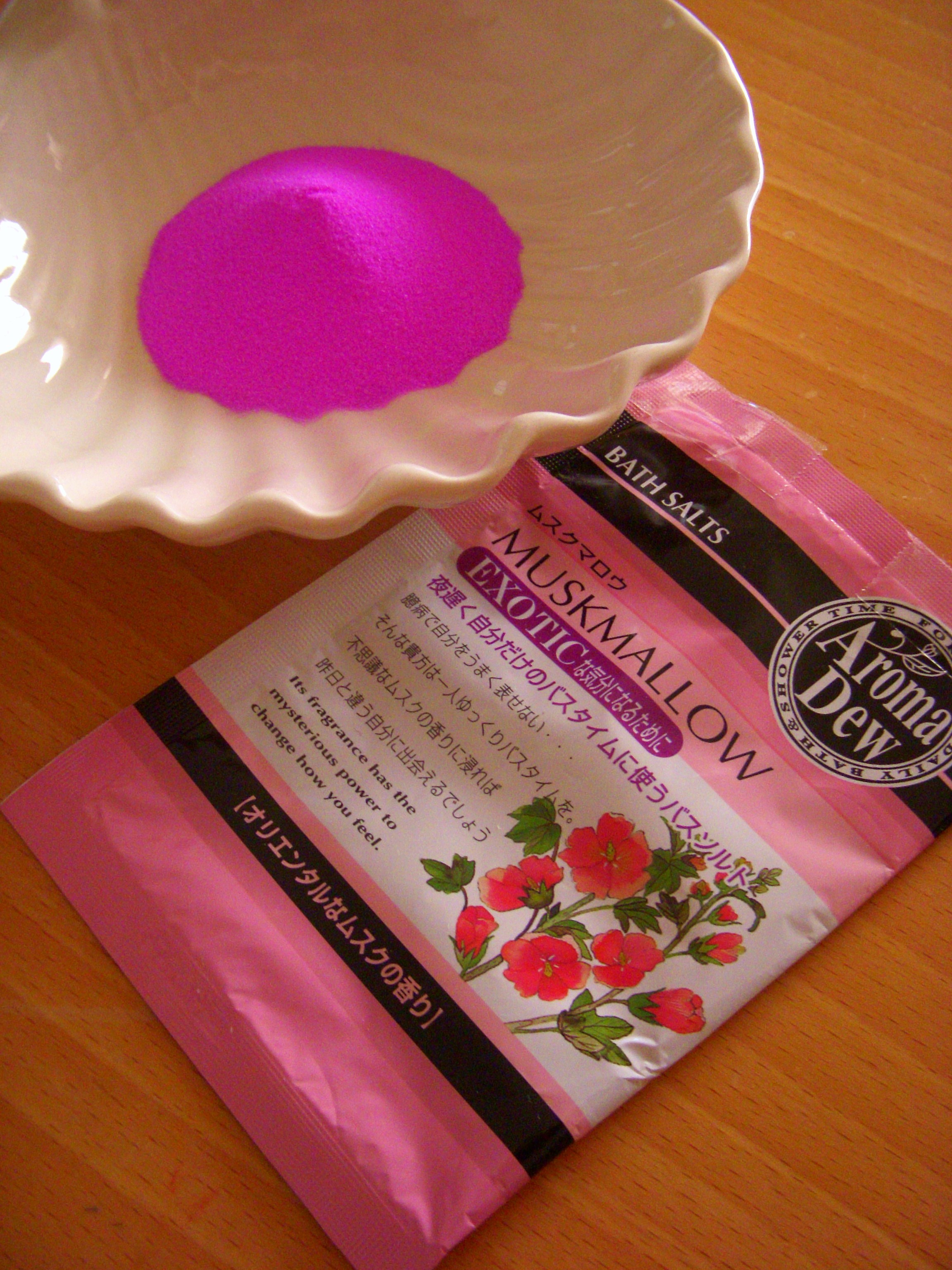 アロマデュウのバスソルトを試してみました。いろんな香りがありますが、私が試したのは、オリエンタルなムスク調の香りムスクマロウです。