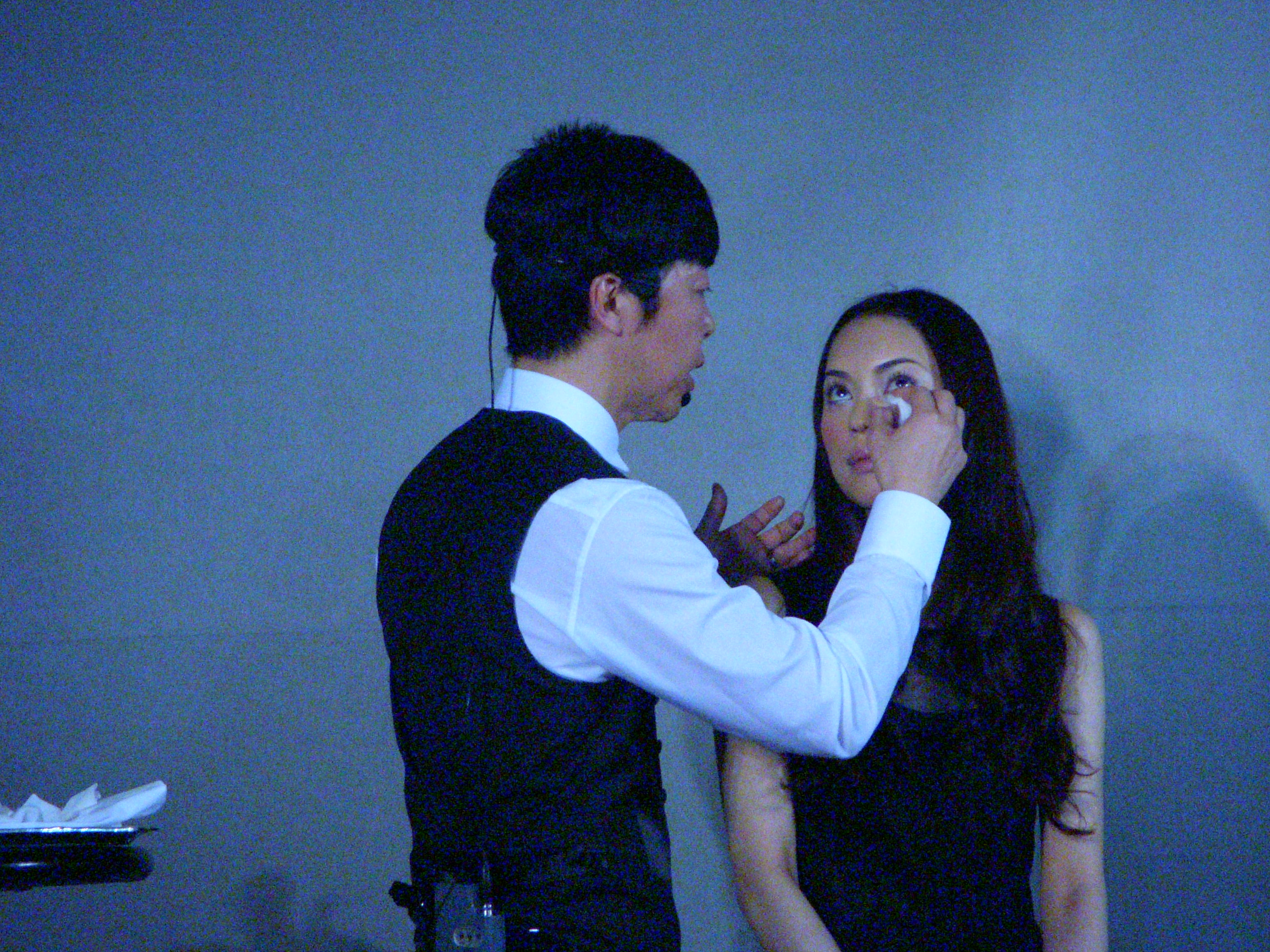 ダブルエクステンション ウォータープルーフ EX カーボンブラックを使って、嶋田ちあきさんが、アイメイクレッスンの生ライブをしてくださいました。(嶋田ちあきさん(写真左)の隣は、モデルの田中玲さんです。)