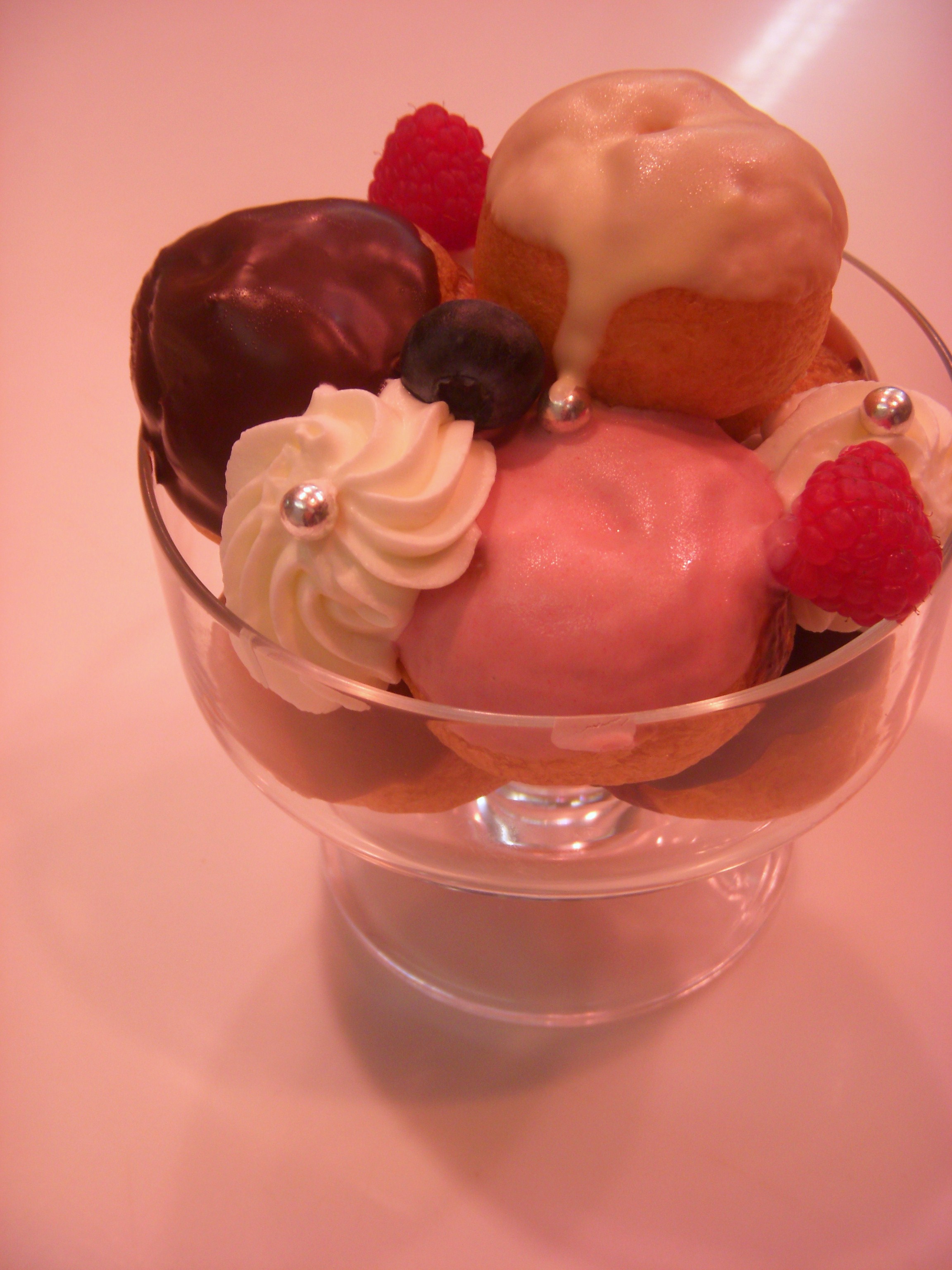 コチラは、牛乳と卵のプチシュークリームに、スイートチョコレート、ホワイトチョコレート、いちごのチョコレートをコーティング。