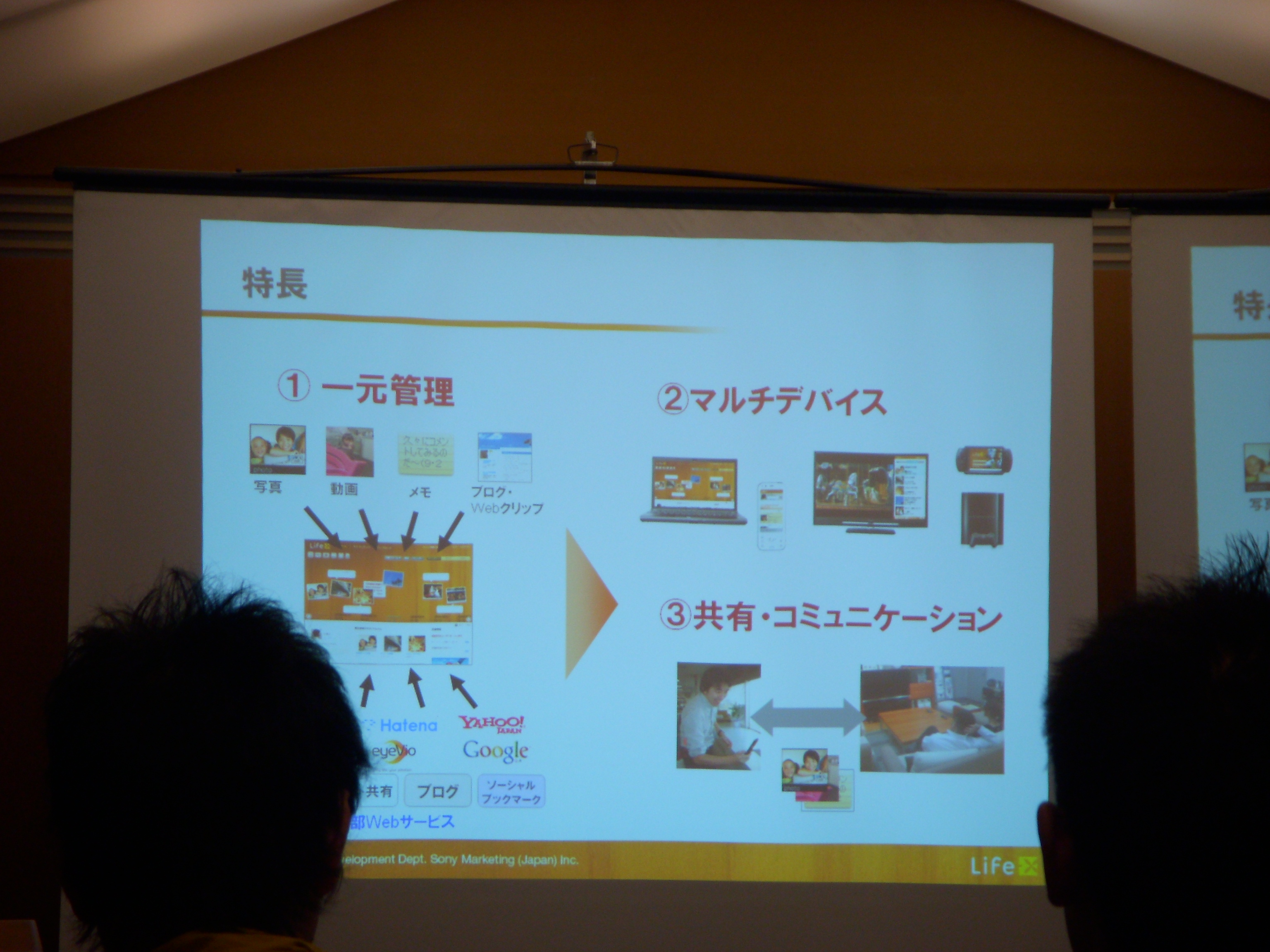 話を聞いているだけでは、いま一つイメージがわき難かったのですが、その場で撮影した写真を、その場でアップロードし、携帯電話、<ブラビア>、PSP(R)、プレイステーション 3で表示したところをリアルに見れると、