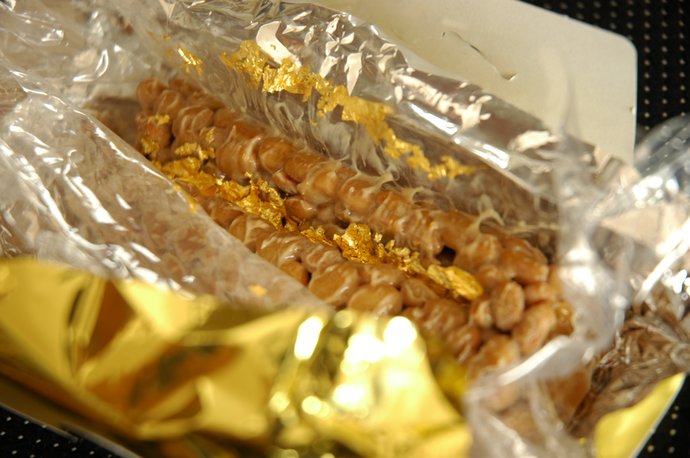 金箔入りなんです・・・。納豆の中で、金がパーっ