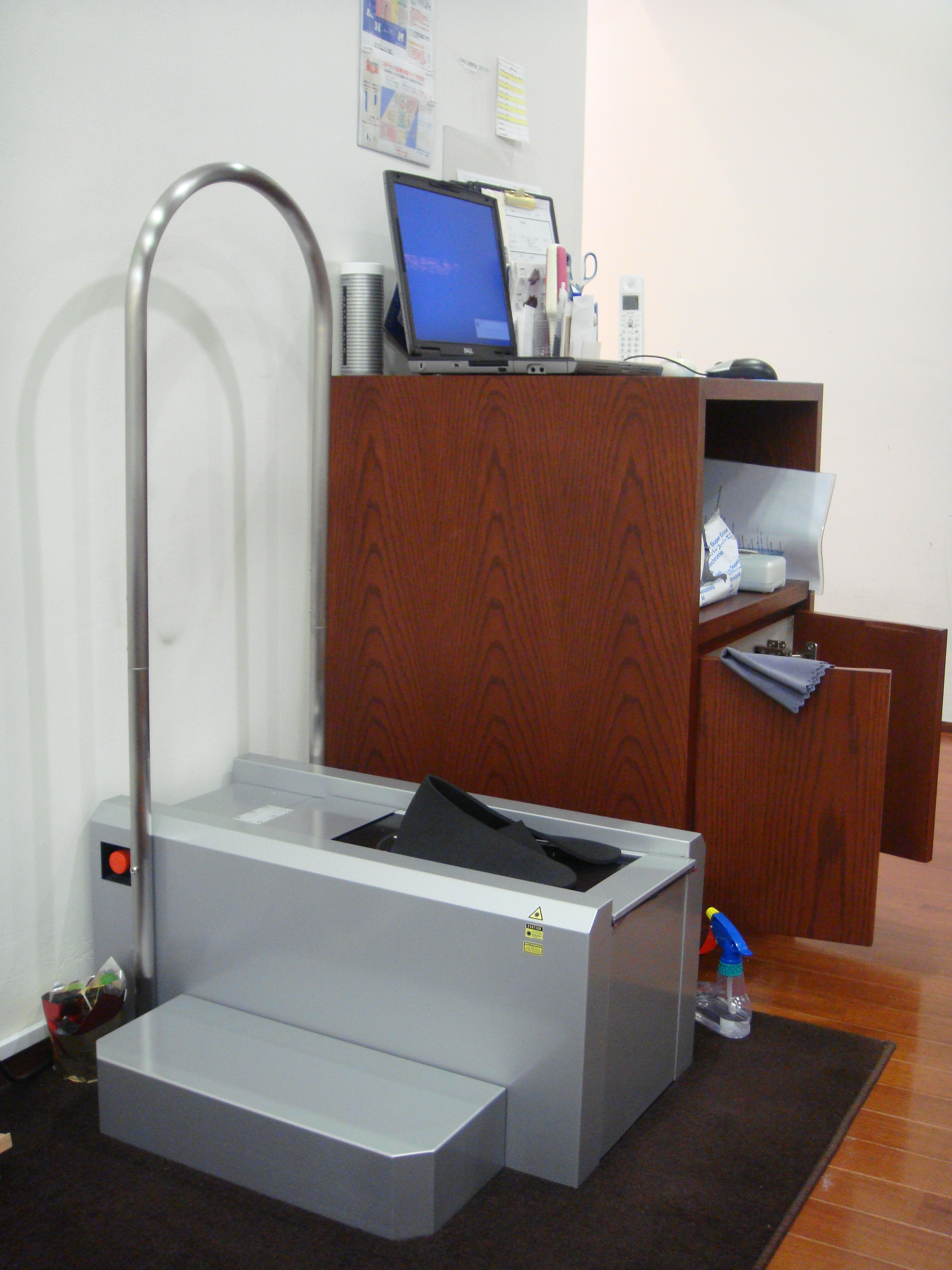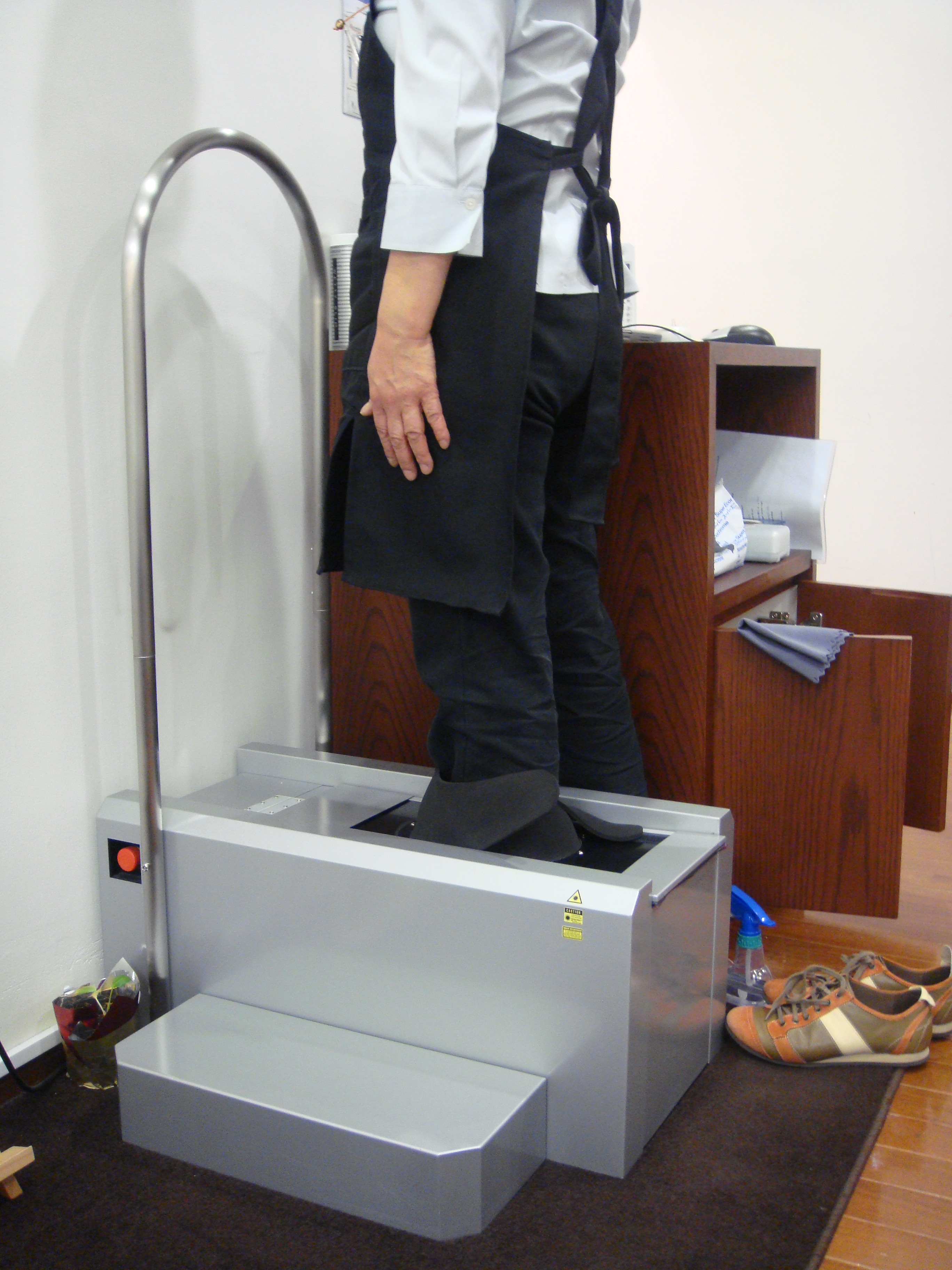計測器(写真のシルバーの箱のようなところ)に足を入れると、内蔵カメラが8方向から、足のデータをとり、PCに送ってくれるのだそう。足の長さ、足の周り、土踏まずの高さ、かかとの傾き、母趾の角度など・・・詳細にチェックして、個人の足のカルテがプリントアウトされるんです。