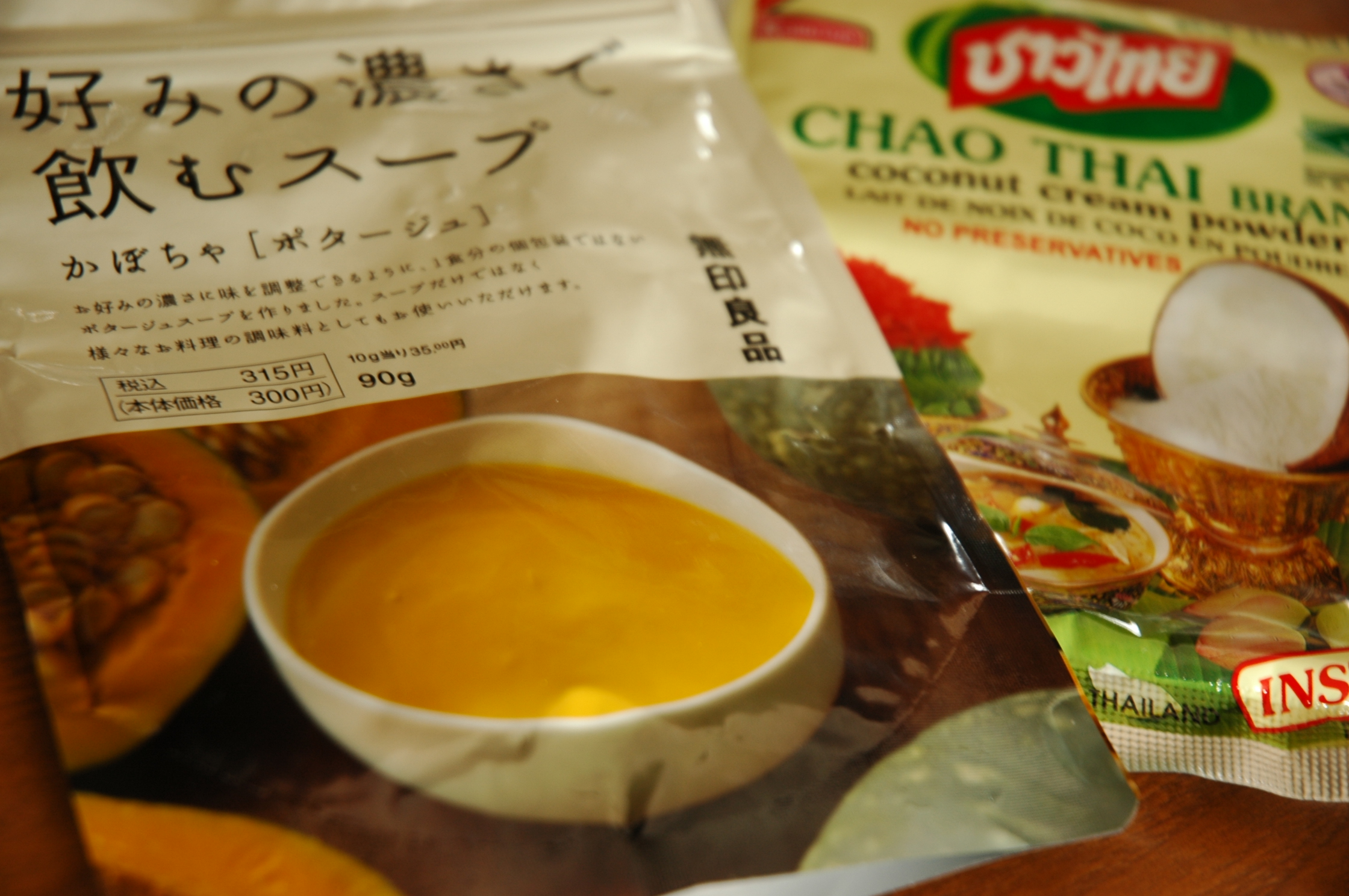 エスニック料理で使った粉末のココナッツミルクが余っていて、何とか使い切ってしまいたい。そこで、ちょっと、やってみたのが、無印良品の好みの濃さで飲むスープ かぼちゃ(ポタージュ)とのミックス。
