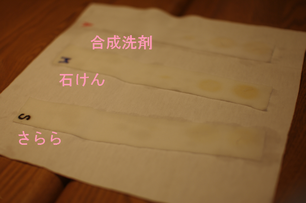 汚れがよく落ちるとされる合成洗剤は、汚れは落ちたものの、生地が白っぽく漂白されてしました。