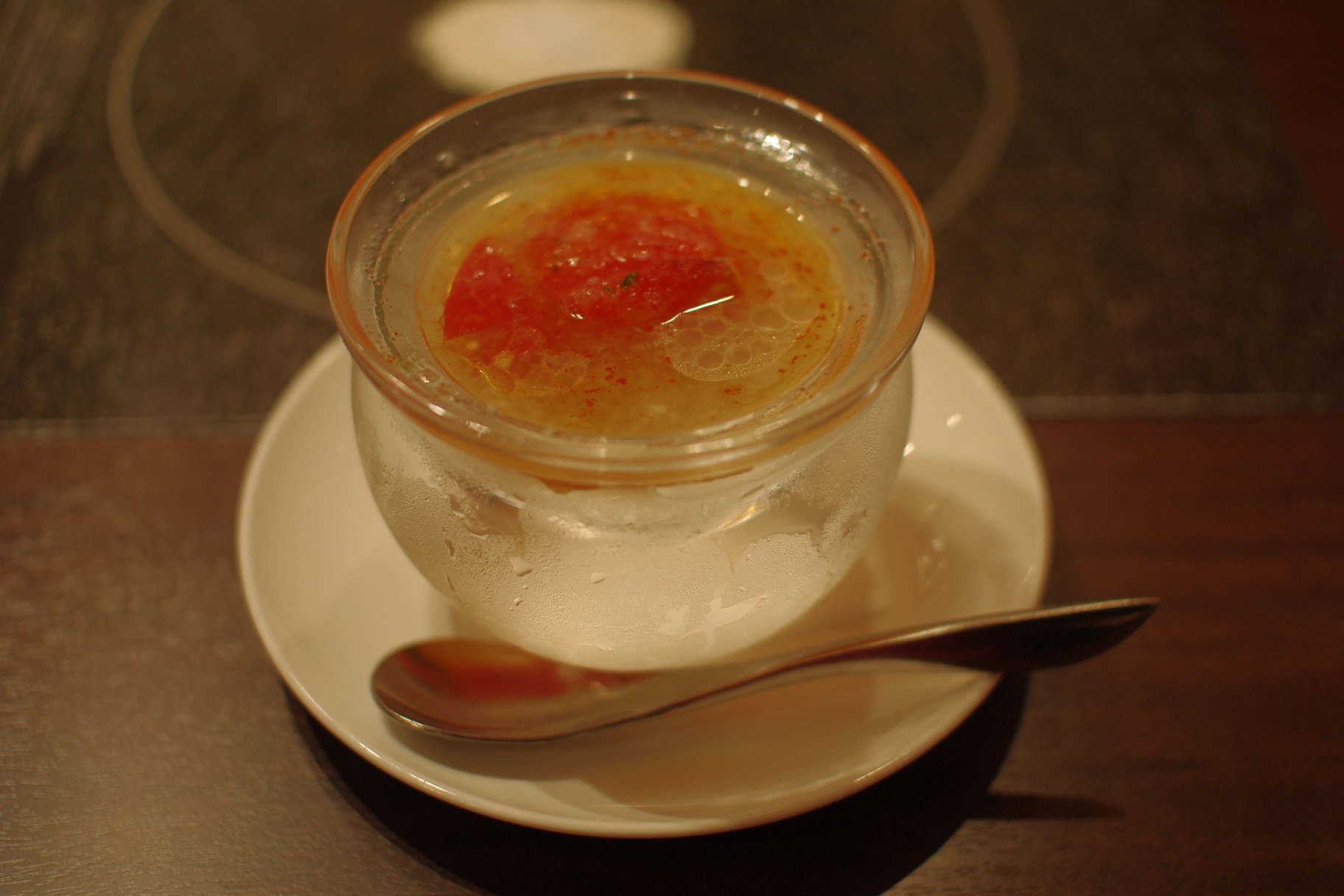 ホテルのヴィシソワーズなんかが入っていそうなグラスで登場。お酢の酸味と鰹のだしで、さっぱり。とても口当たりがいい。