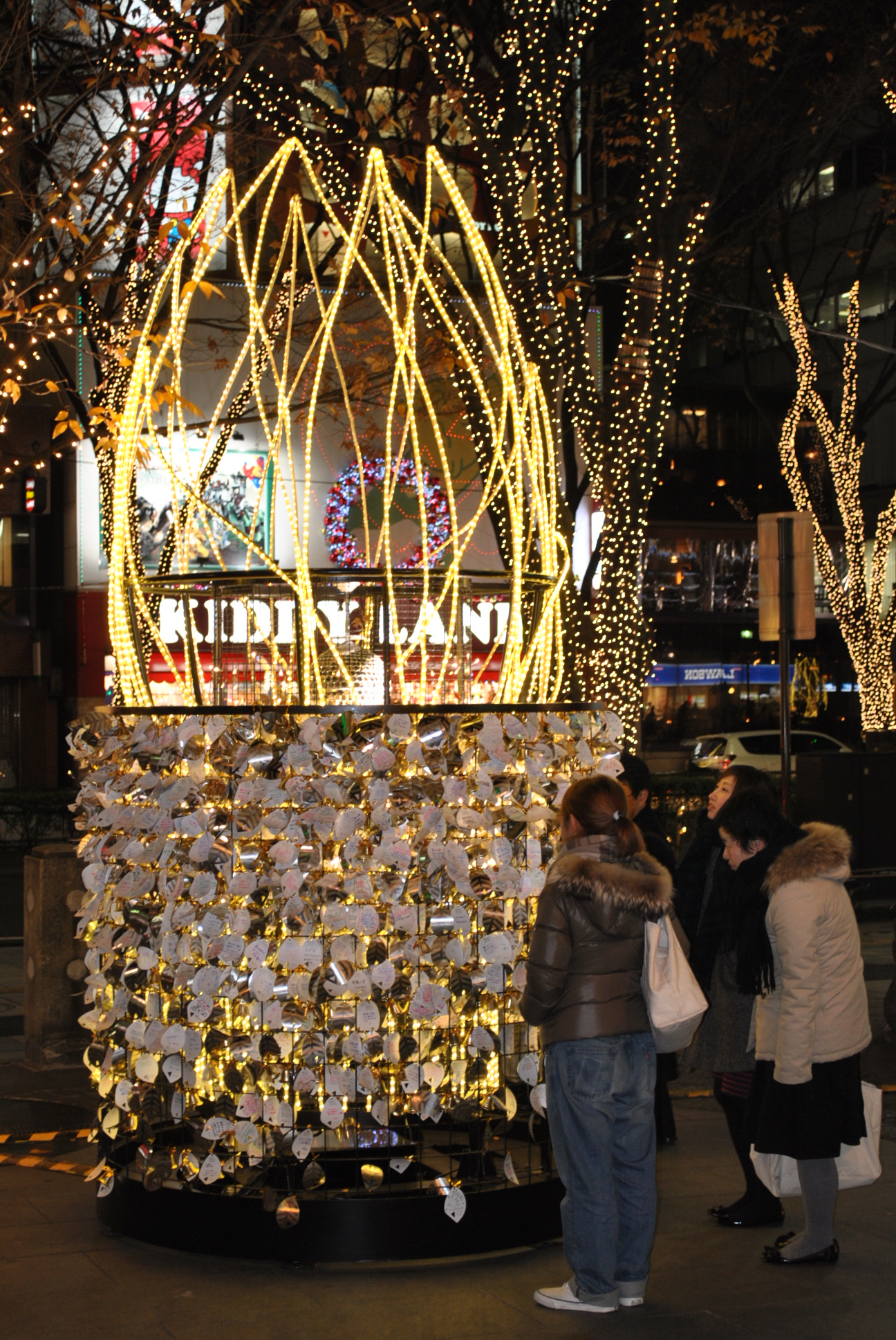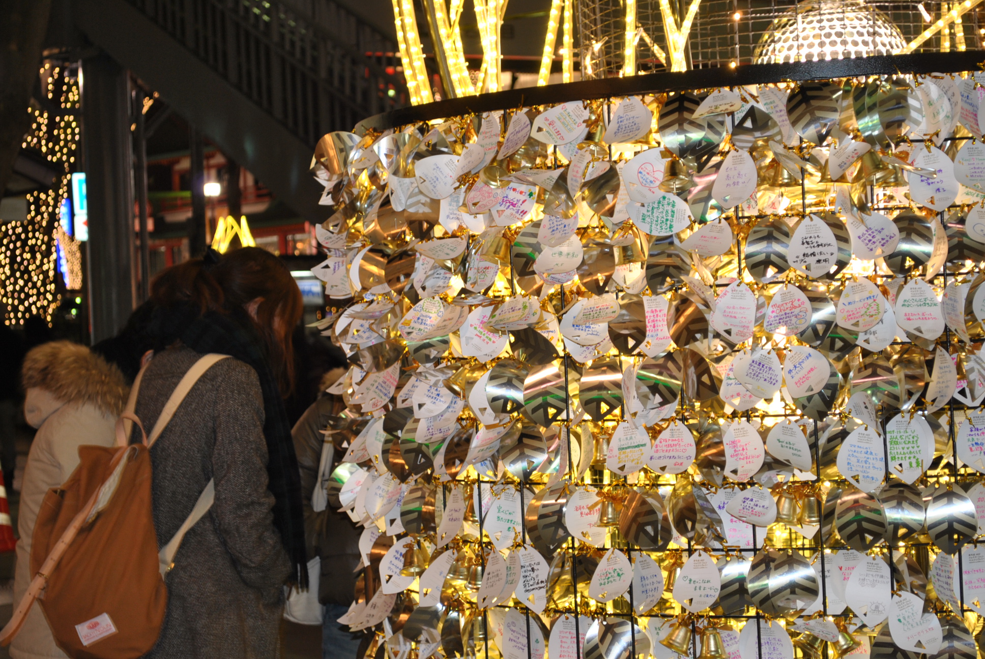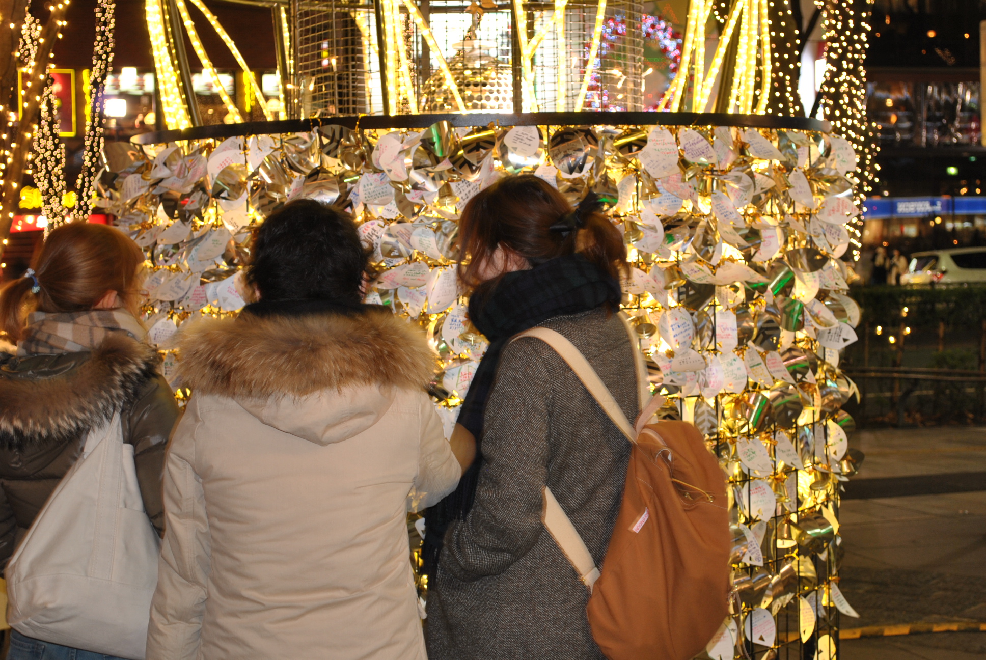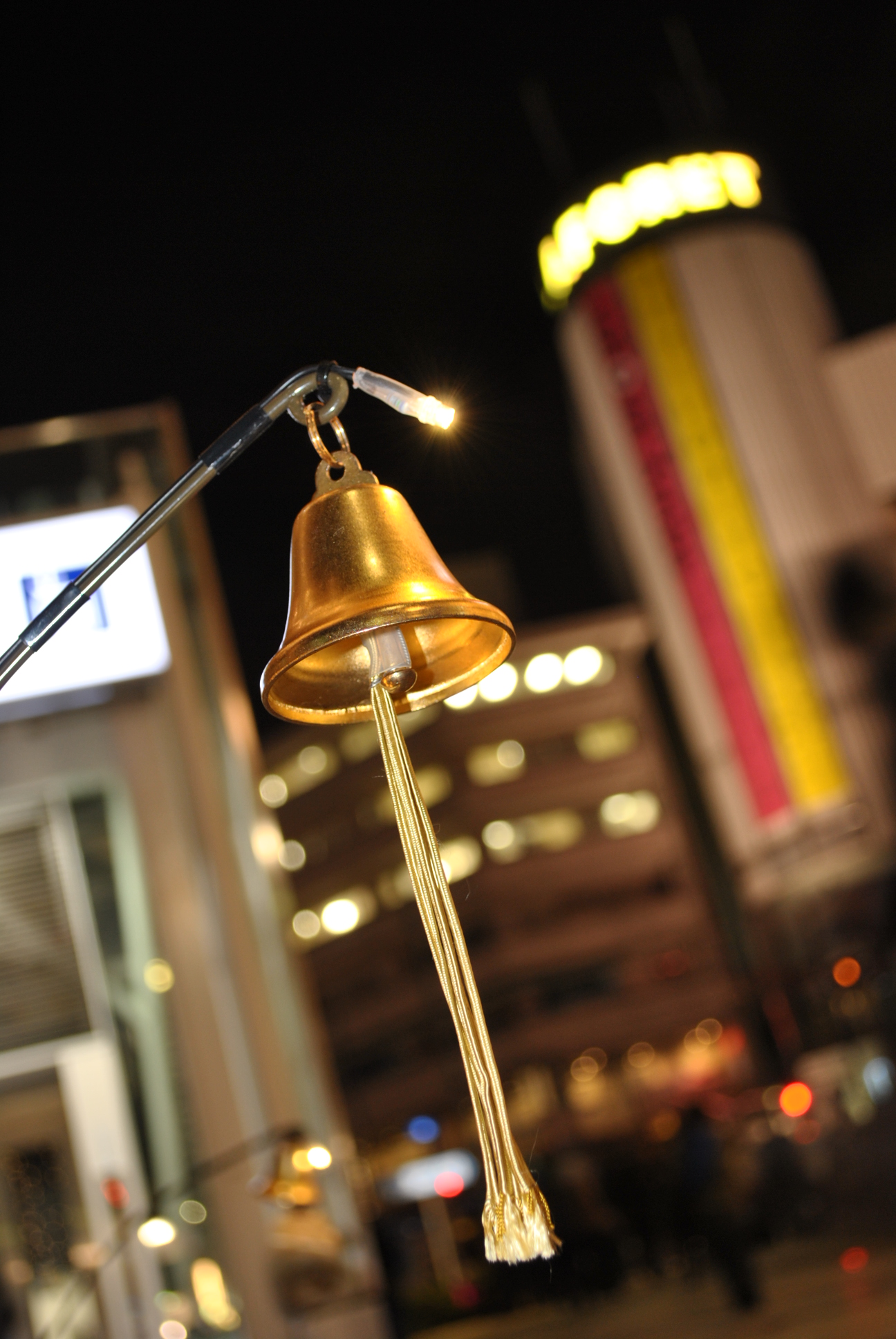 歩いてみると、イルミネーションにまじって、木の根元につけられたベルを発見。