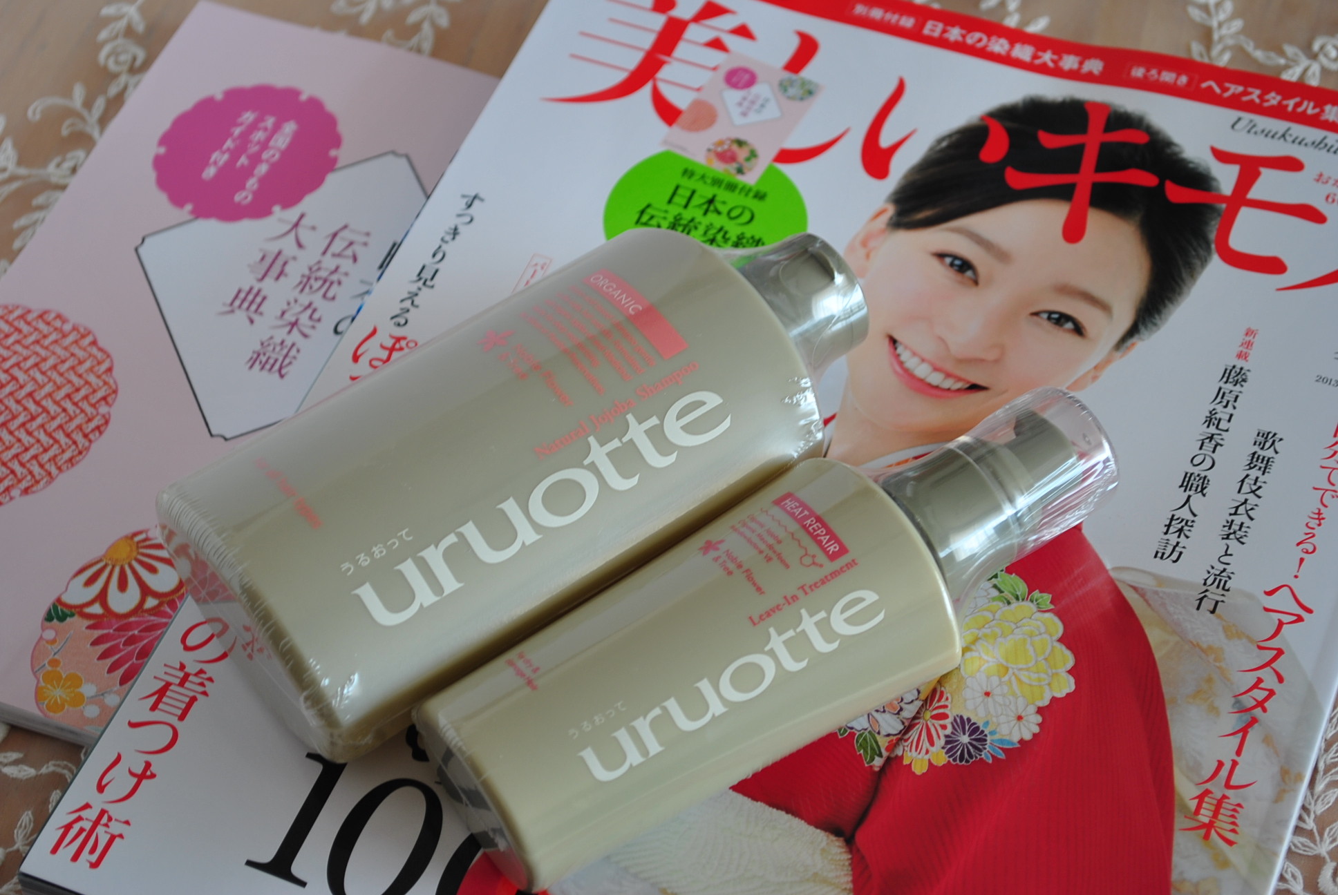 上記販売店以外の書店で売られている通常の美しいキモノには、uruotteのナチュラルシャンプーとリペアミルクの付録はついてないのですが、