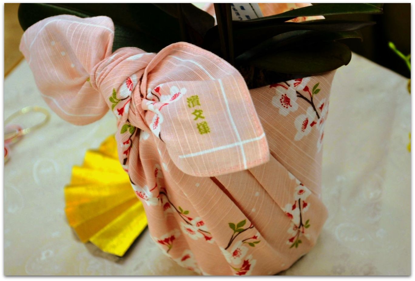 小布は、横浜発信の遊び心のある個性的なデザインが特徴の濱文様(はまもんよう)というブランドのものが使われています。現代風にアレンジされながらも、どこか懐かしい温もりと、日本の粋のようなものが感じられます。小布は、花が終わったら、お弁当包みや小さな風呂敷としても使えます。