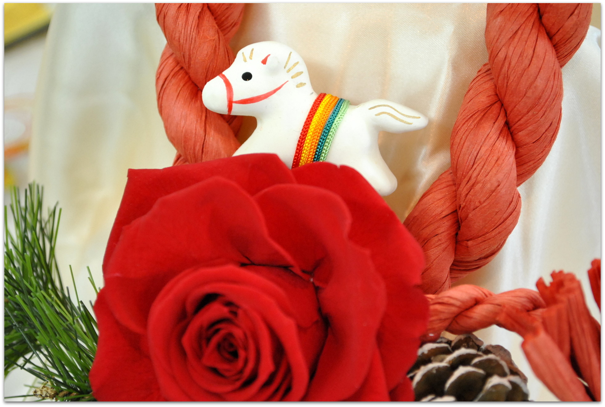 午のピックがすごくかわいい♪中央には、真っ赤なプリザーブドフラワーのバラがあしらわれ艶やか。