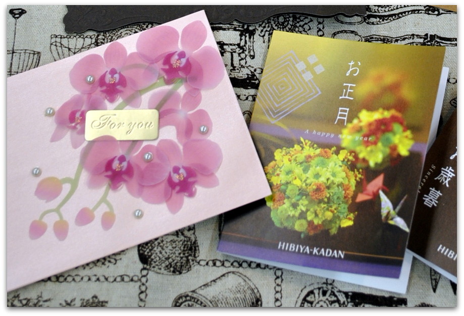 オンラインショッピング限定の上品なデザインの胡蝶蘭メッセージカード(これは、有料カードですが、全角100文字以内で好きなメッセージを入れることができる。胡蝶蘭も2次元の印刷ではなく、立体的になっています。)など、