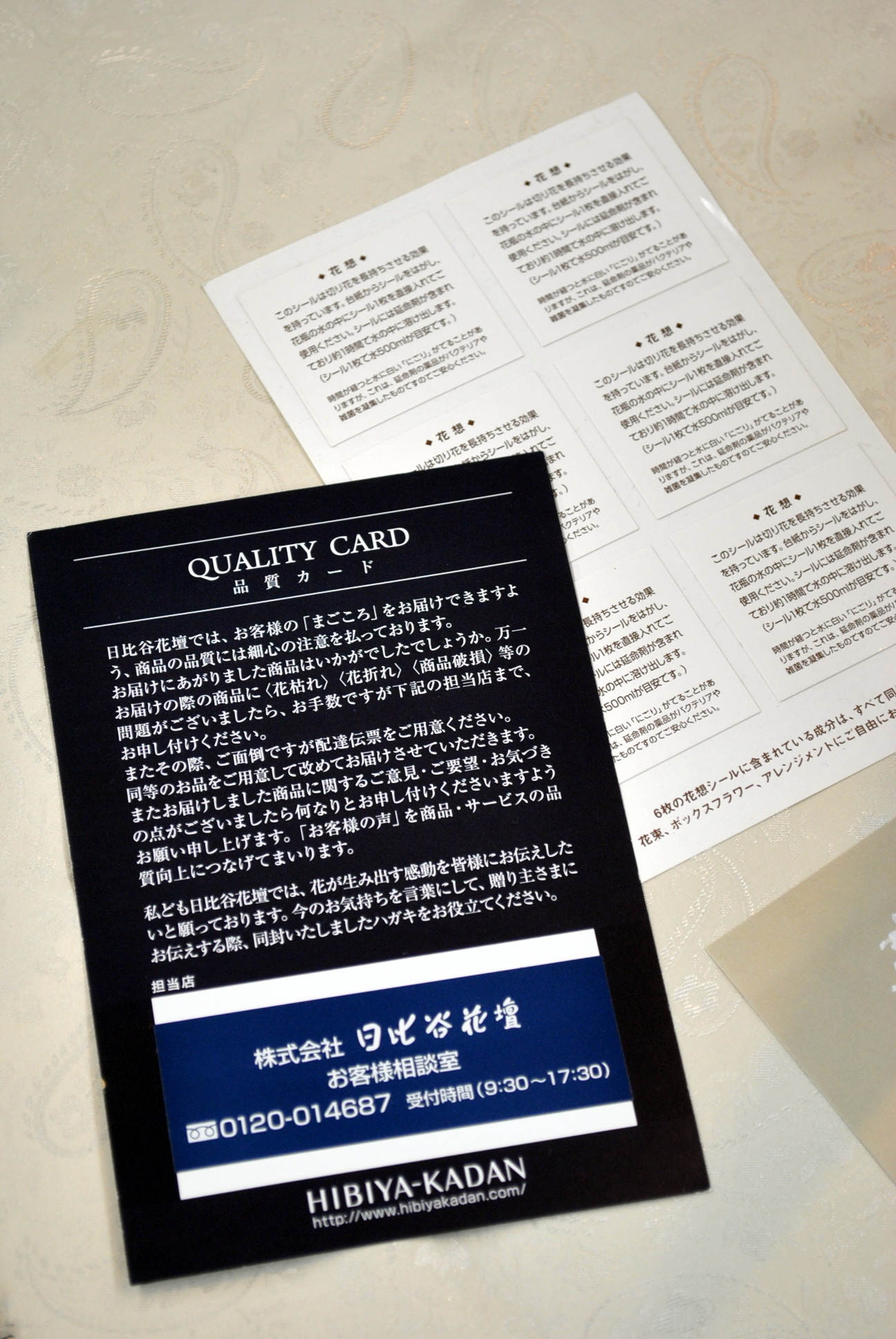 「QUALITY CARD」には、万一、届けの時の品に「花枯れ」「花折れ」「商品破損」等の問題があった場合、お客様相談室まで、連絡すると、同等の品を用意して改めて届けてくれるという高品質を約束するものです。