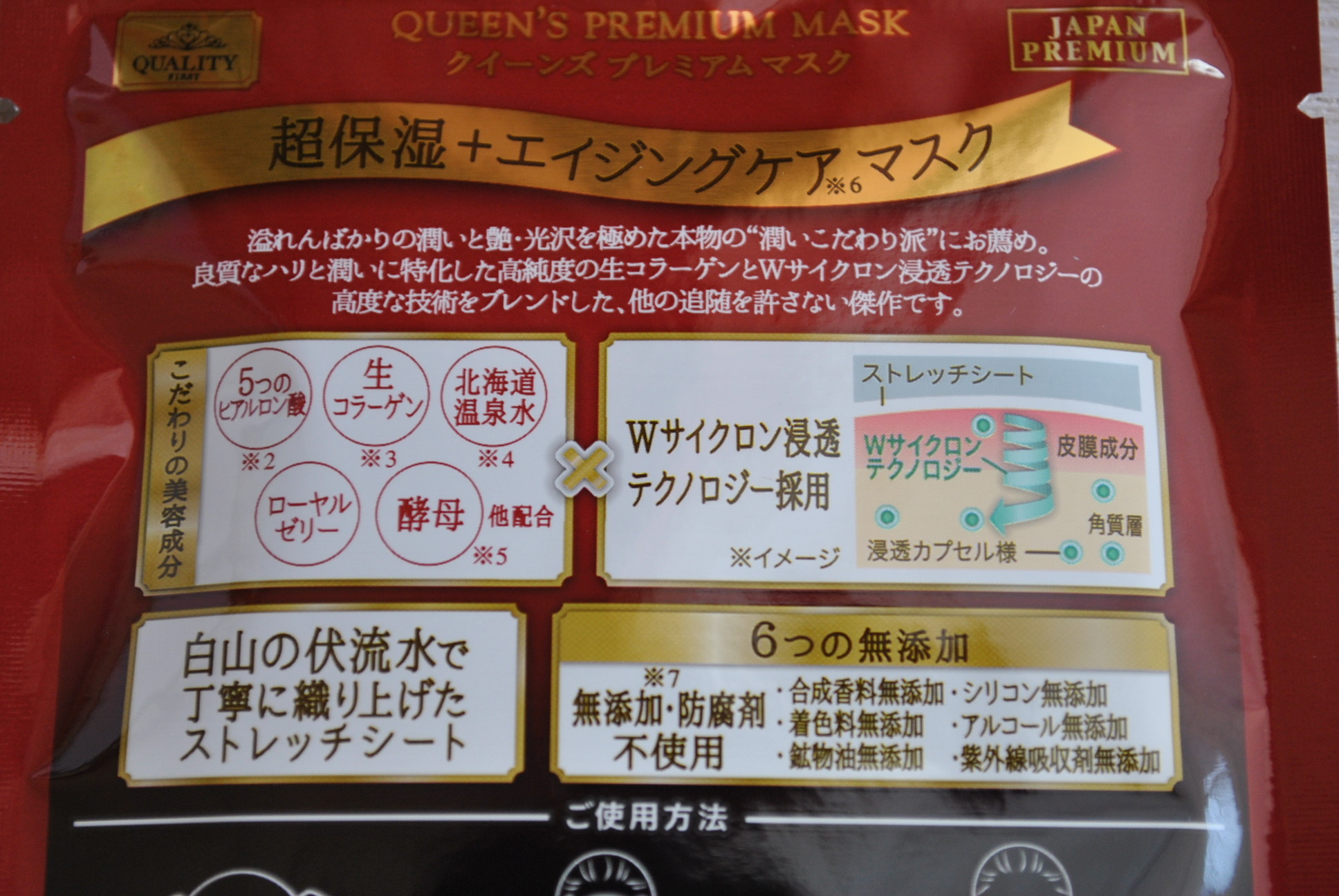 で、今回は、3/30に新発売されたクオリティーファーストさんの個包装タイプのシートマスク クイーンズプレミアムマスク 超保湿+エイジングケアマスクをモニター体験させていただきました。