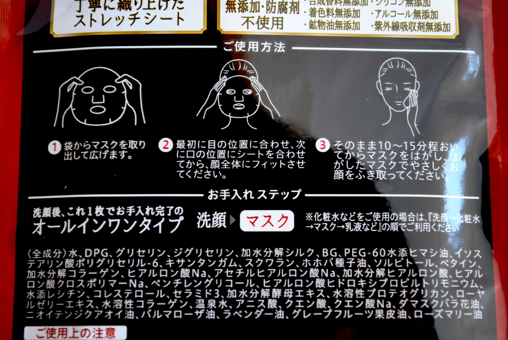実際、使ってみて、まず思ったのは、大容量版のシートマスクに比べて、すごくシートに厚みがあること。湿布みたいだなと思いました。肌への密着感は、大容量タイプの薄手のシートの方があると思ったけど、厚手の割に、ちゃんと密着します。柔らかく厚みのあるシートに包まれると、ちょっと、気持ち的に贅沢な感じもするし、これはこれでいい。