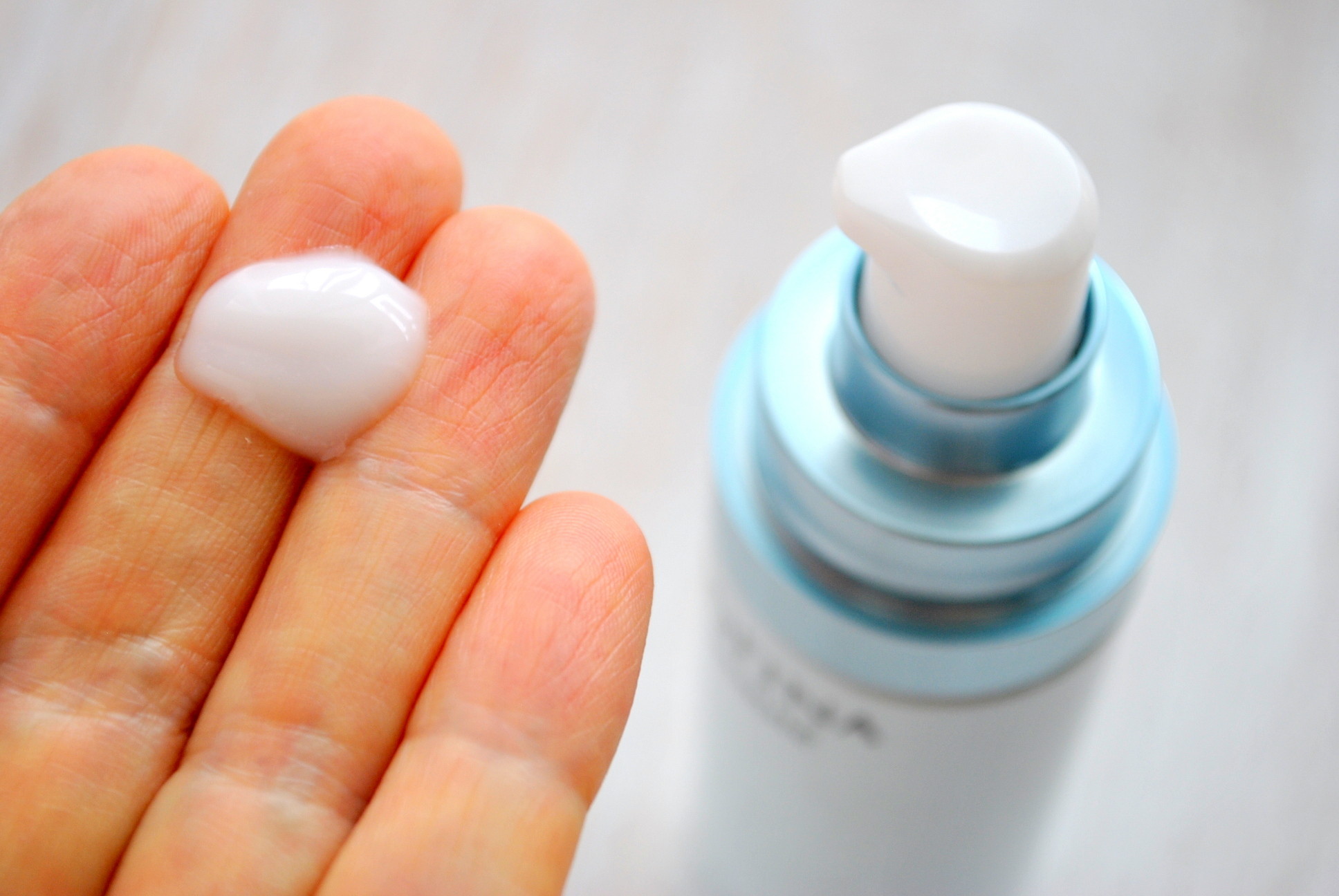 乳液の使用量は、3プッシュ。ゆるいクリームのようです。乳液にしては、こんなちょっとでいいの?と思いましたが、のびがよく、すっと肌になじんでピタッと肌に定着します。高保湿ですが、べたつき感なく使いやすいです。スキンケア直後のうるおい密度が高いハリ肌が、持続します。