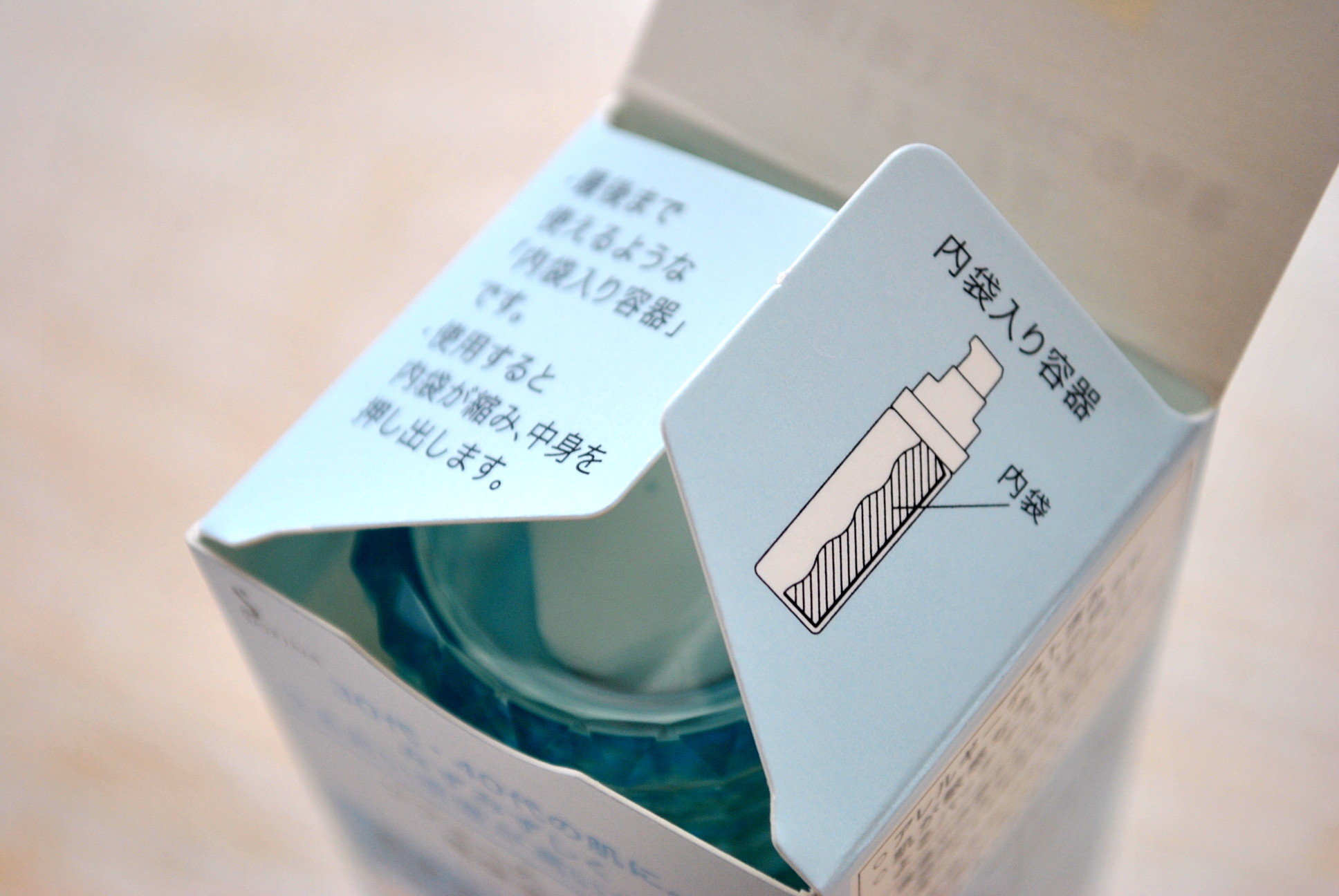 乳液は、私の好きなポンプ式容器。1回3プッシュと使用量もわかりやすい。乳液の容器は、透明でないので、見た感じ、ちょっと、わかりにくいですが、中身を最後まで使えるような「内袋入り容器」になっています。