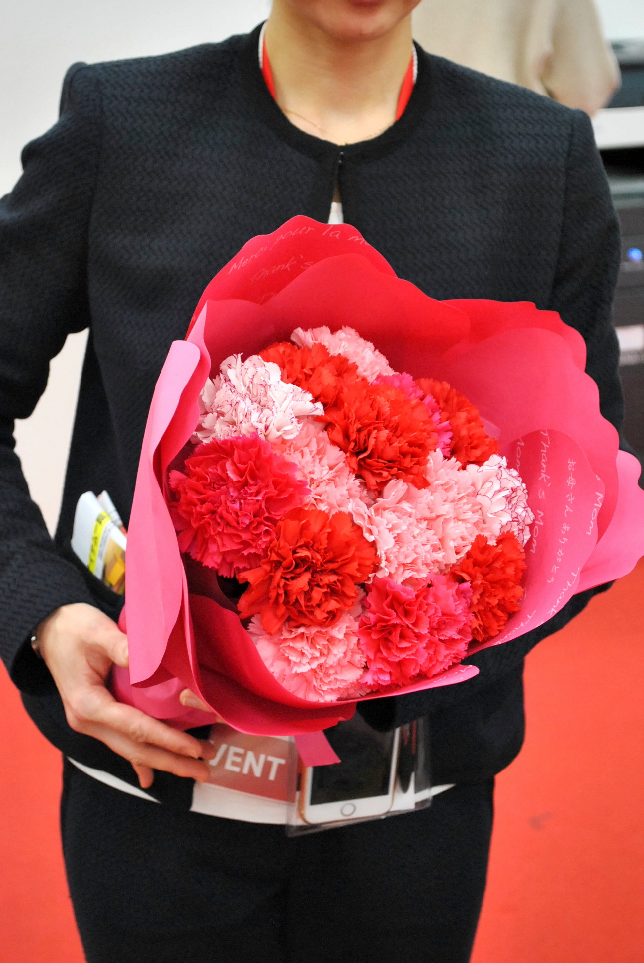 いろんなピンク色のカーネーションを束ねて、まるで花びらのようなラッピングでくるんだら・・・。全体がまるで大きなカーネーションのようになったブーケです。