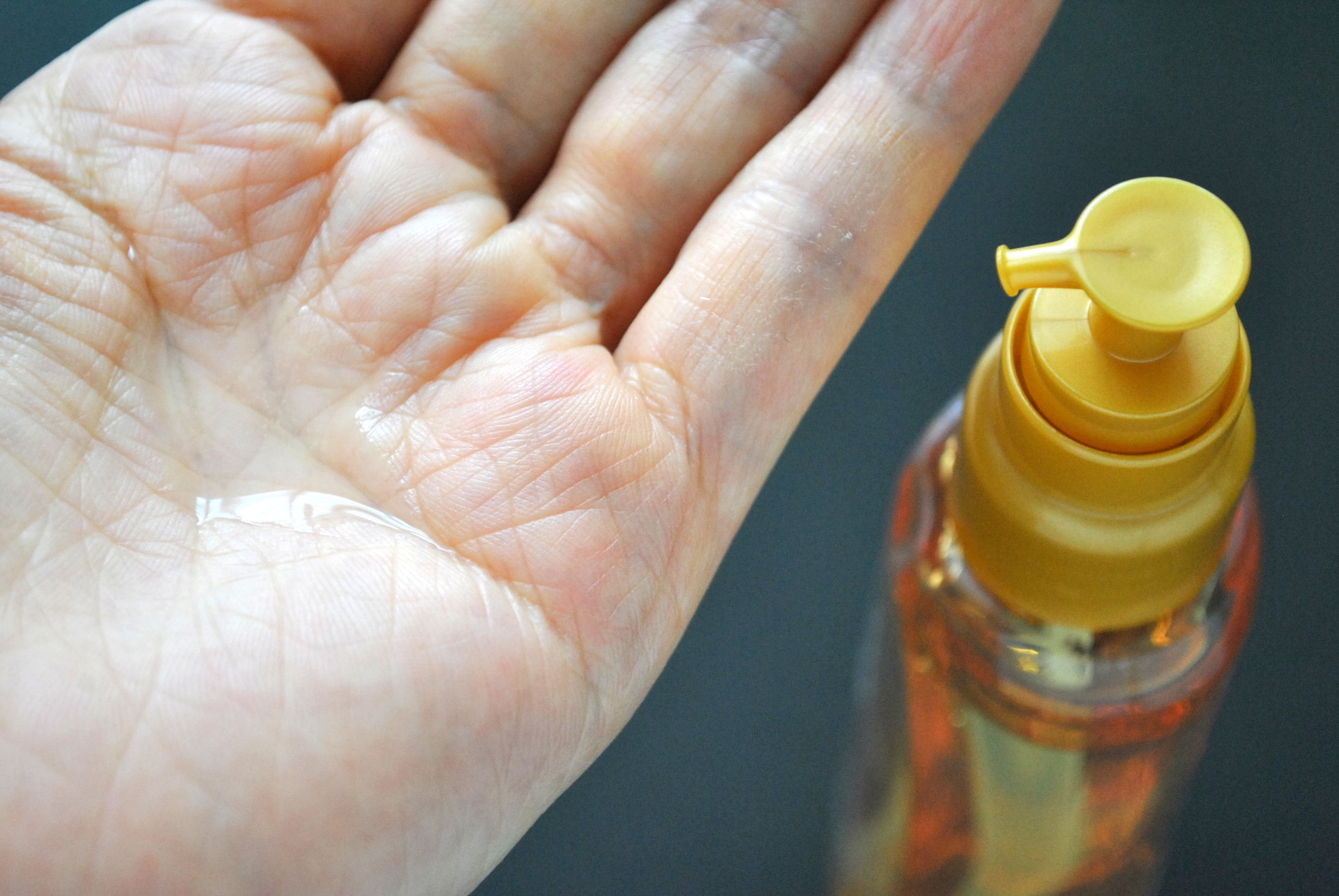 手にとったときは、とろみのあるこっくりしたオイルですが、べとつかず、サラッと軽く髪になじみます。