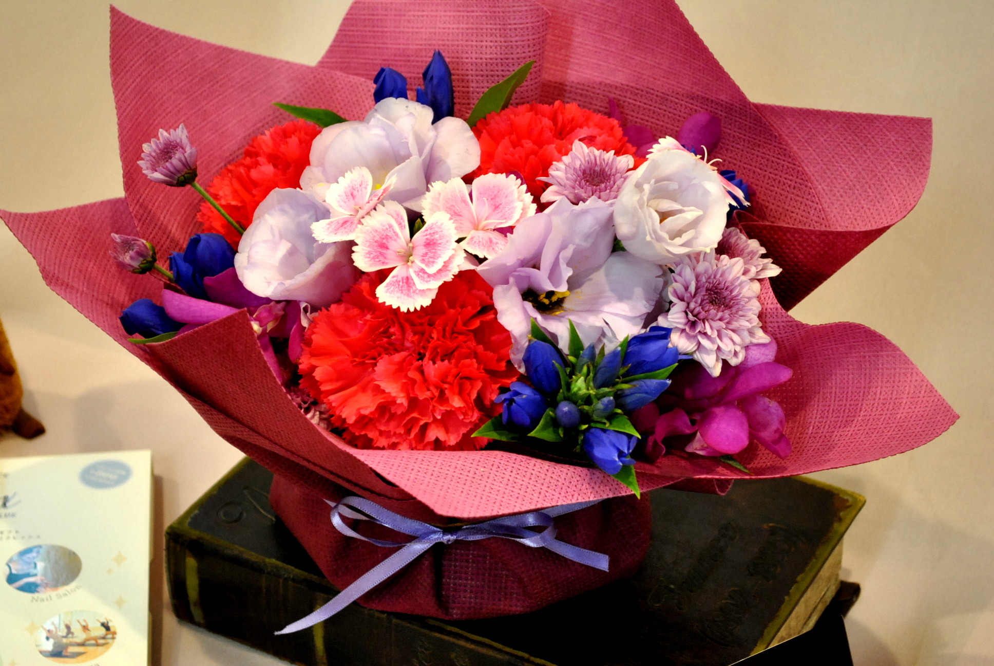 セットのアレンジメントは、ラベンダーカラーのリシアンサスにナデシコやリンドウといった秋の花をあしらった上品なもの。(老けこんだ?)敬老の日ギフトのイメージとは思えないような印象です。
