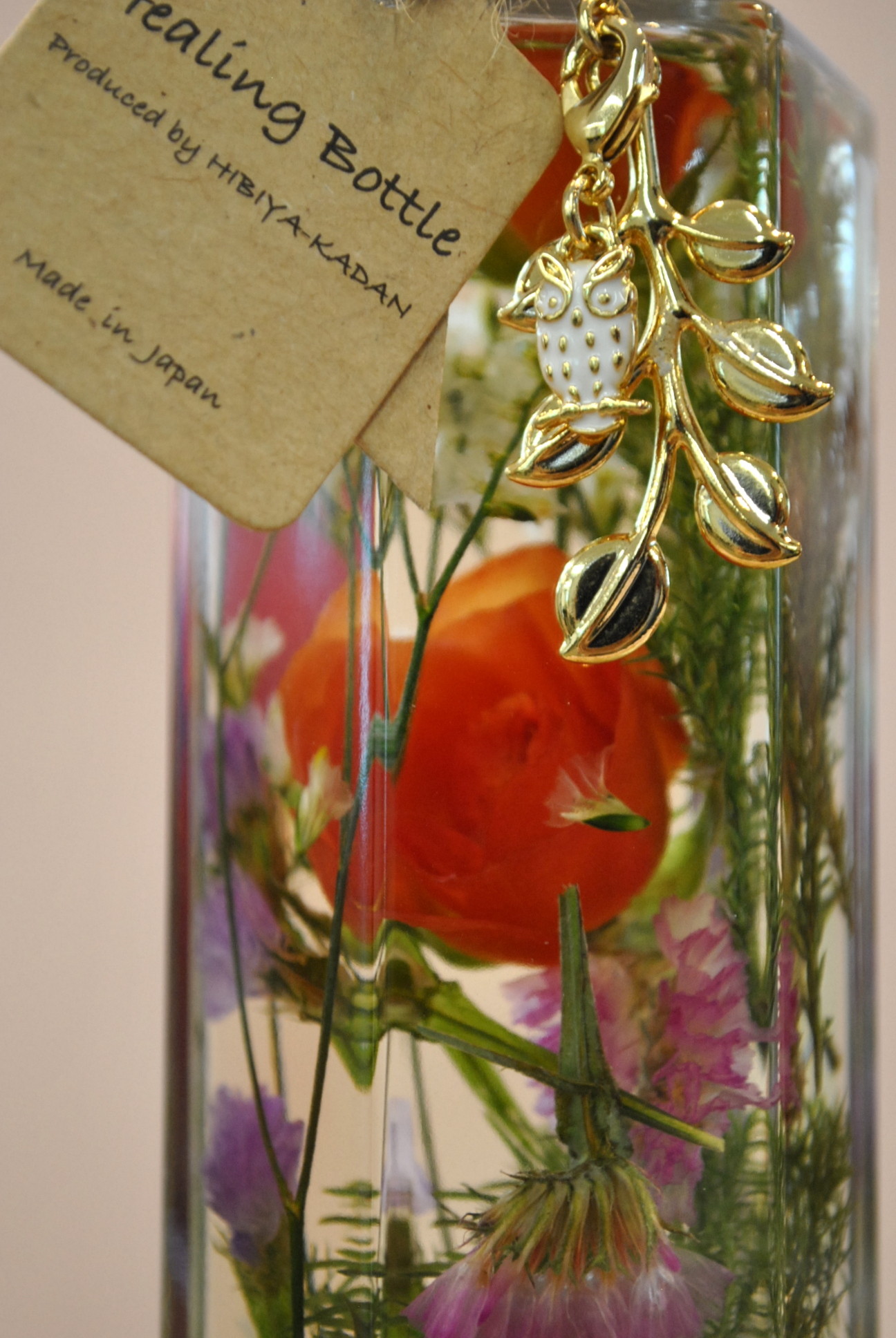 日比谷花壇さんの秋のヒーリングボトルは、実り豊かな秋の雰囲気をイメージしてセレクトしたお花や植物と、タグには、縁起のいい白いフクロウのチャームをつけています。