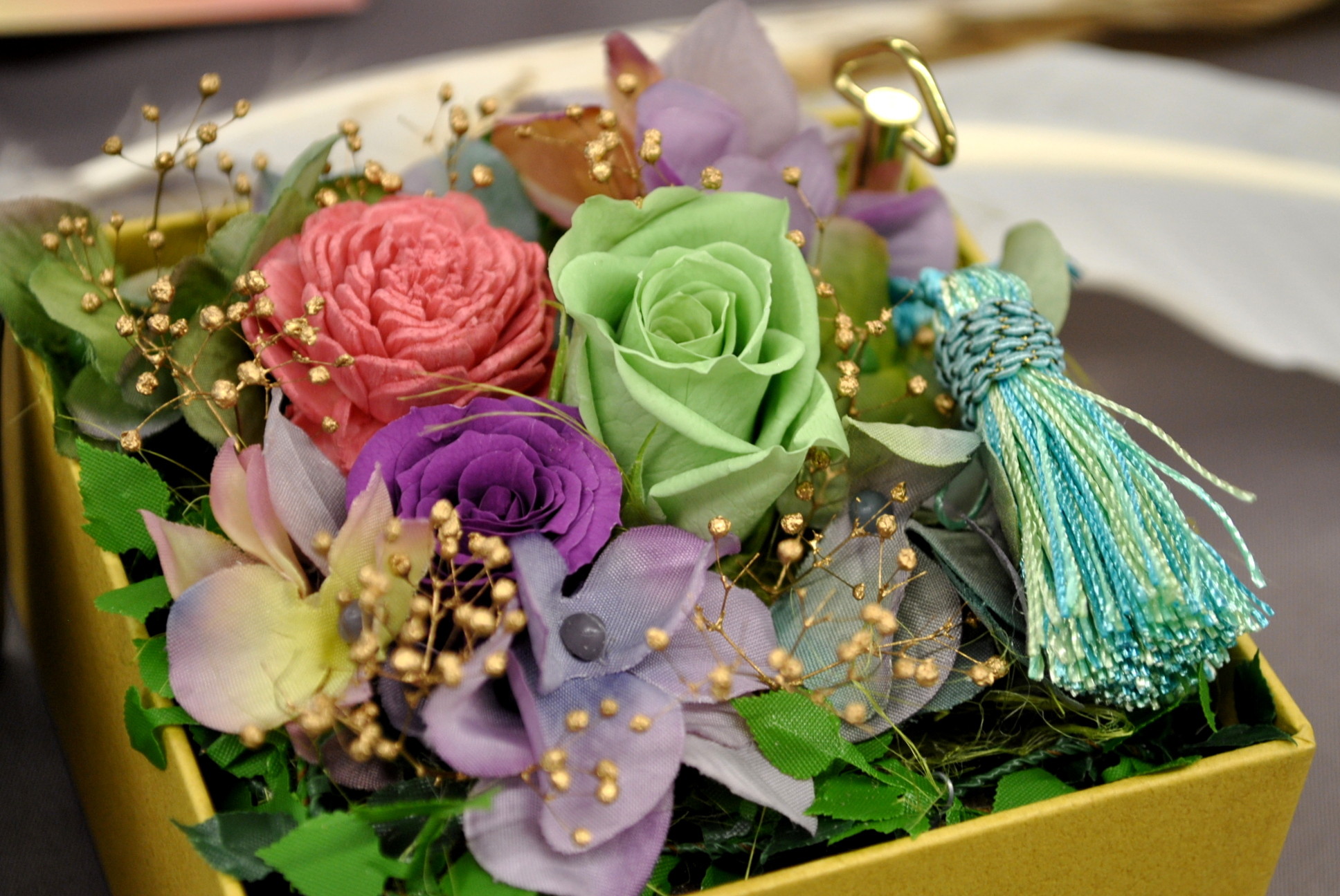 プリザーブドフラワーにほこりがかぶらないよう、蓋を閉めた状態で、飾って置くだけでも、素敵です。