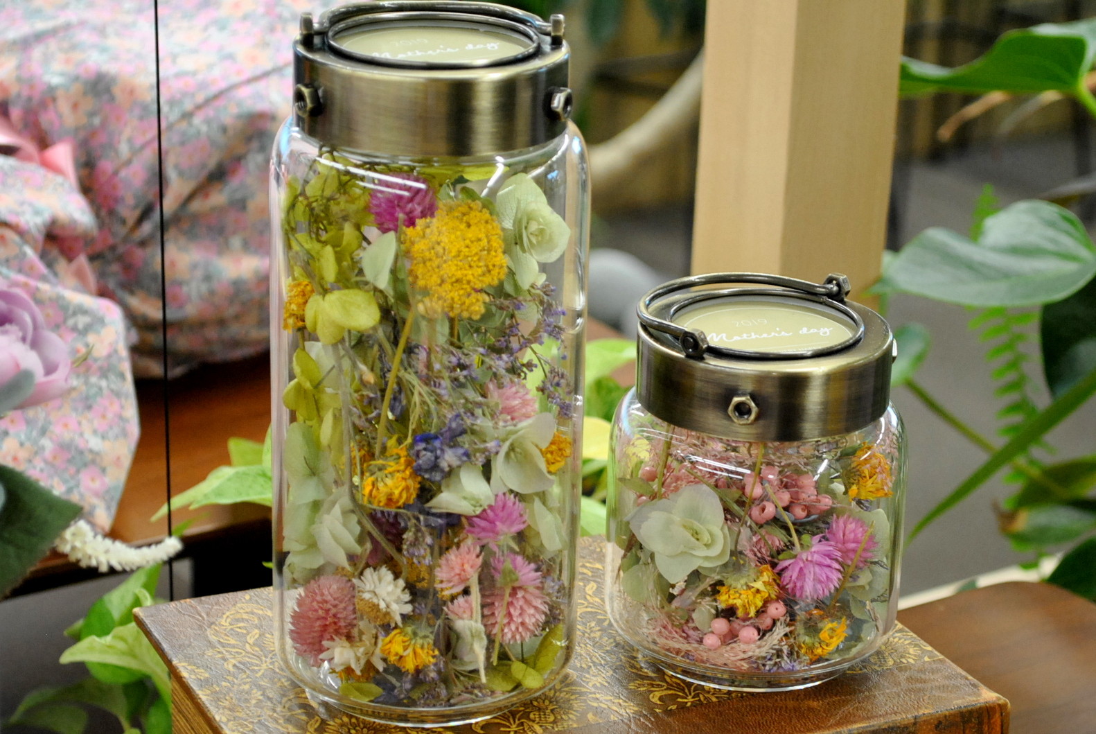 ガラスのキャニスターに入ったドライフラワー。生花とは一味違ったナチュラルな独特の風合いが魅力です。