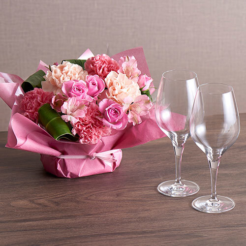 【日比谷花壇】母の日父の日を一緒に贈る「アレンジメントとペアワイングラス」セット