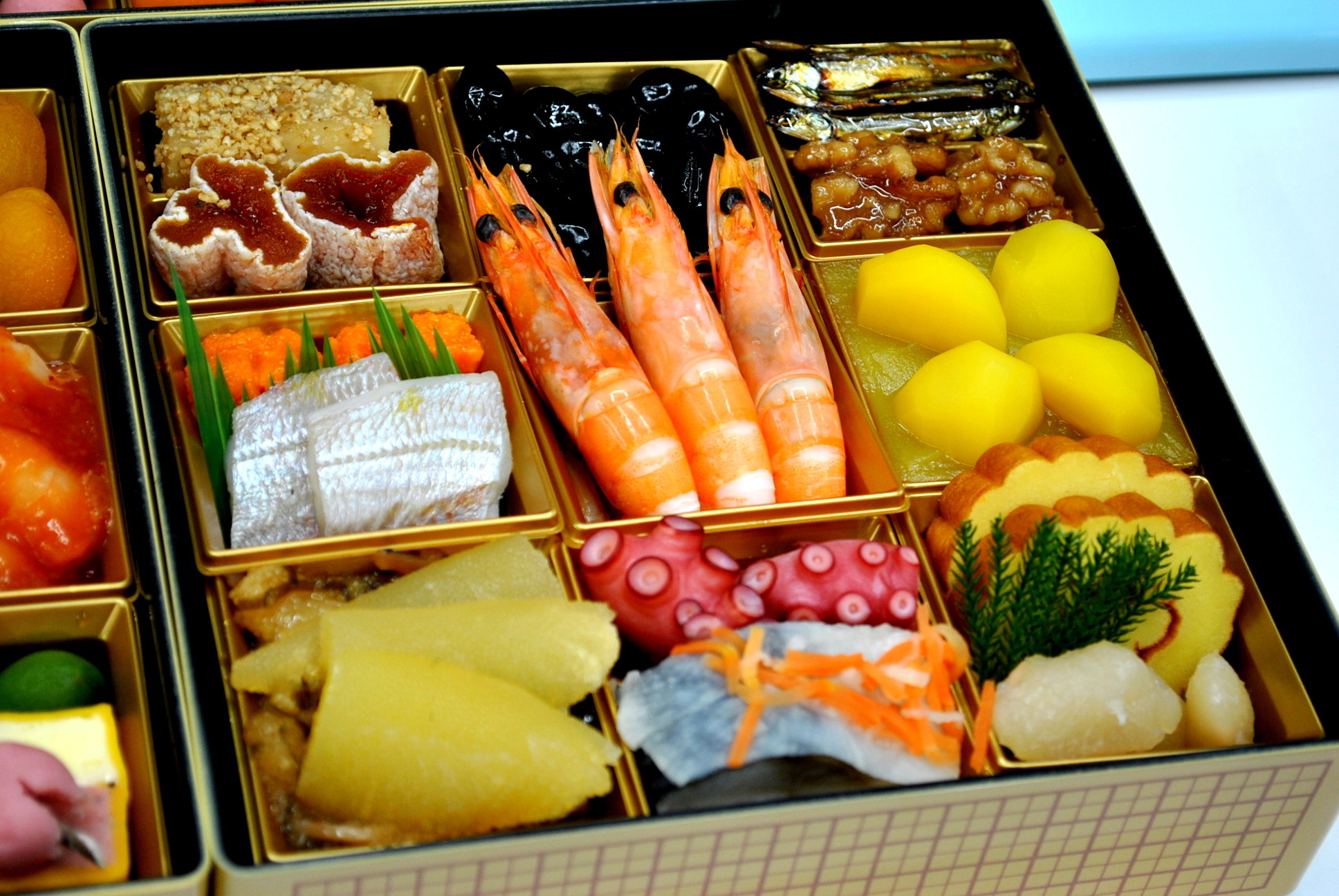 一の重は、伝統のおせちらしい、黒豆、田作り、有頭海老煮、数の子、伊達巻、たたきごぼう・・・などが入った、和の重。