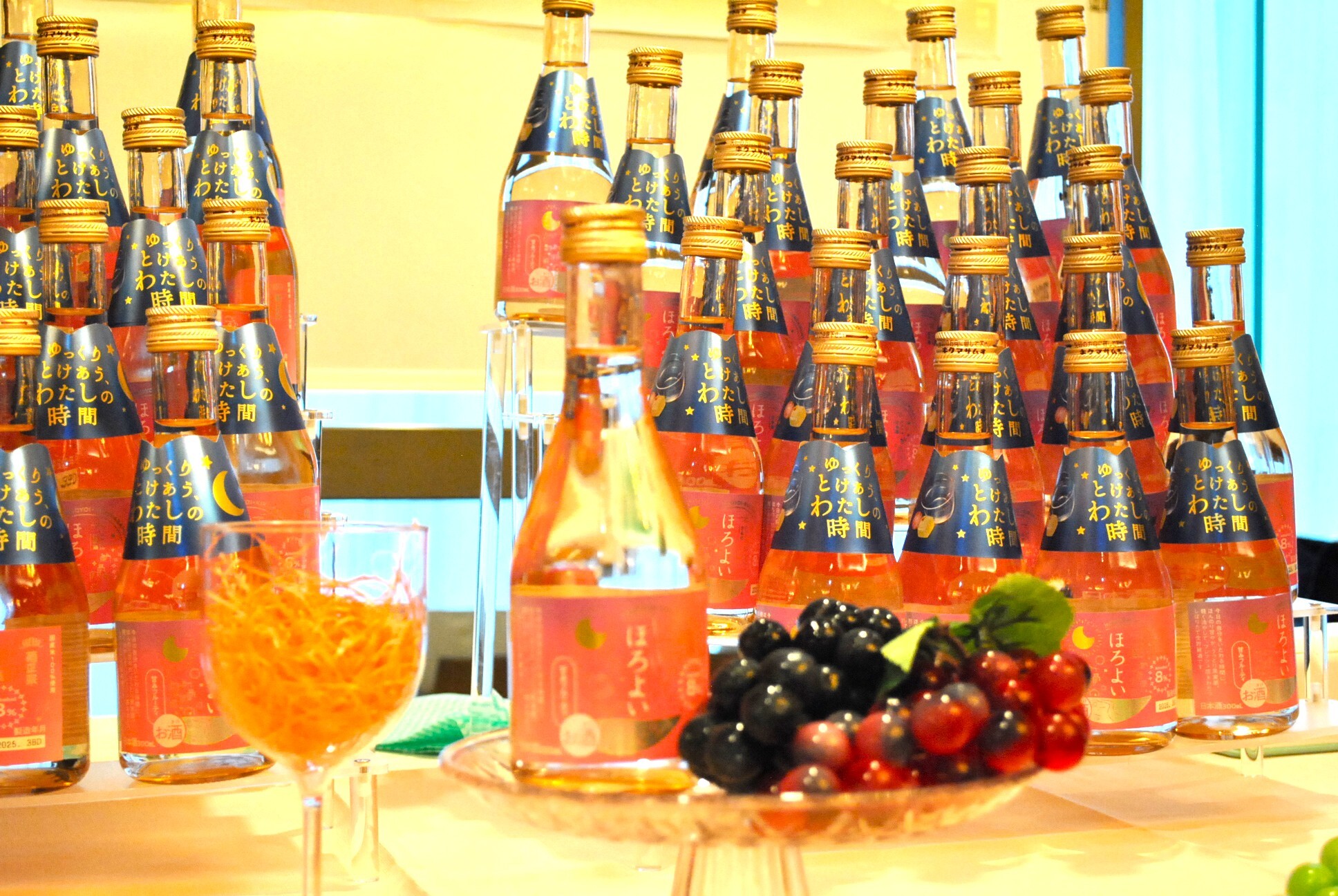 菊正宗さんのほろよいは、ほんのり甘くて、フルーティーな香りがして、飲みやすく、とても美味しかったです。あまり普段日本酒を飲まない女性でも、これは、きっと、好きだと思う。ブースに、ぶどうのイミテーションが置いてあったんですけど、ぶどうのような優しい甘み、プラムのような酸味が特徴のお酒というのも、そういわれてみれば、そうなのかもしれないなぁと思いました。