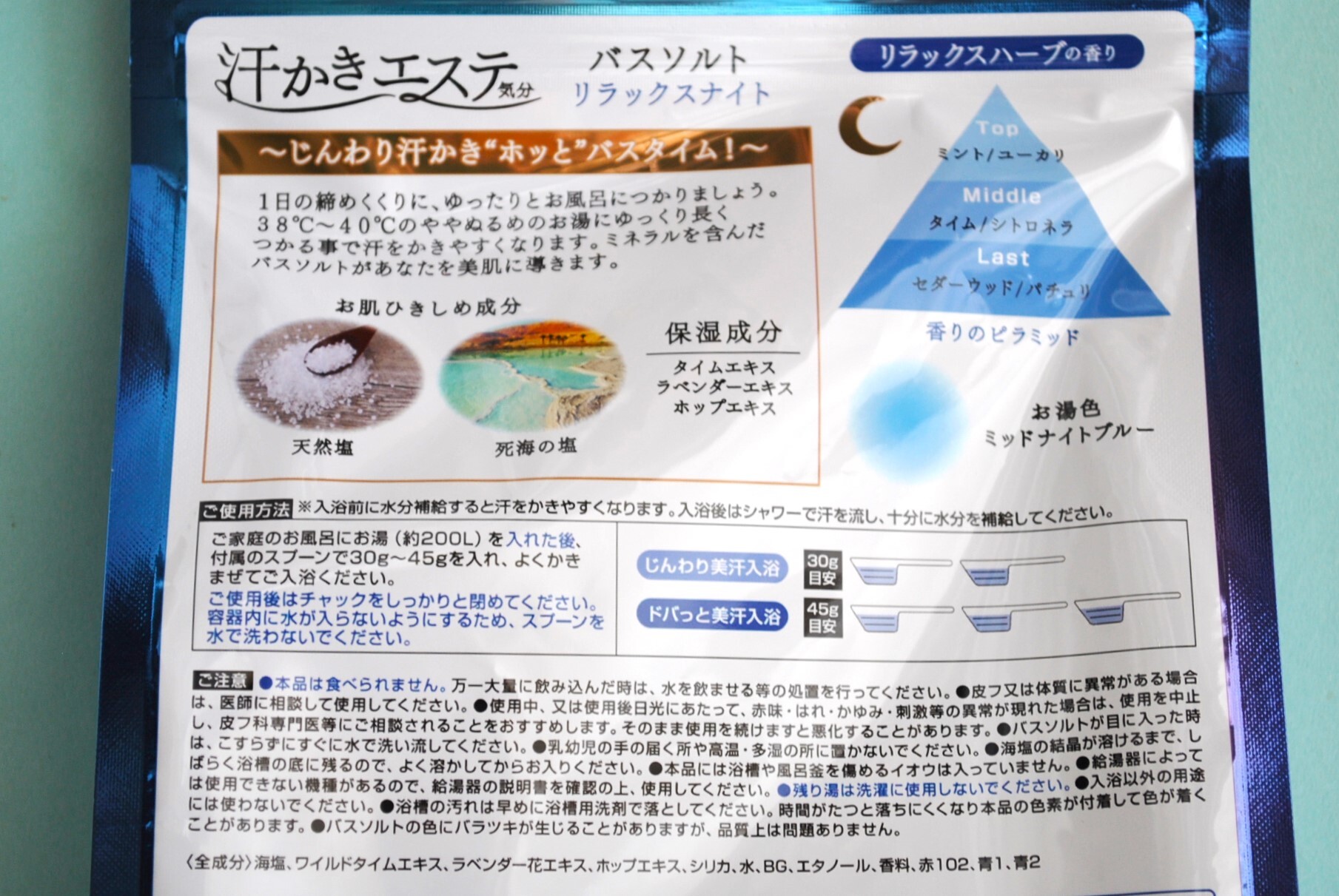 商品に配合されている塩はミネラルたっぷりの天然国産塩+肌のひきしめ成分として死海の塩を配合。保湿成分にラベンダーエキス、タイムエキス、ホップエキスを配合しています。