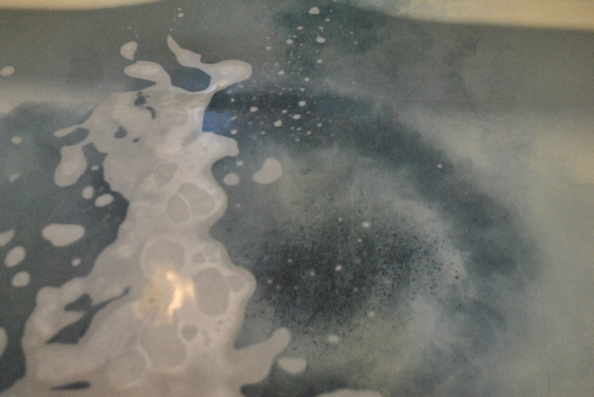 お湯に入れると、透明な紺色、ミッドナイトブルーの水色になります。塩の粒粒はすぐに溶けました。