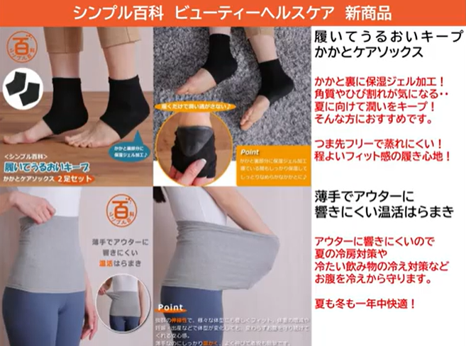 『履いて潤いキープかかとケアソックス』は、かかとの潤いをキープするソックス。ソックスの裏側のかかとに当たる部分に保湿ジェル加工がされています。つま先部分がないので、蒸れにくく、かかとの角質やひび割れが気になる、夏に向けて潤いをキープしたい方のケアにお勧め。