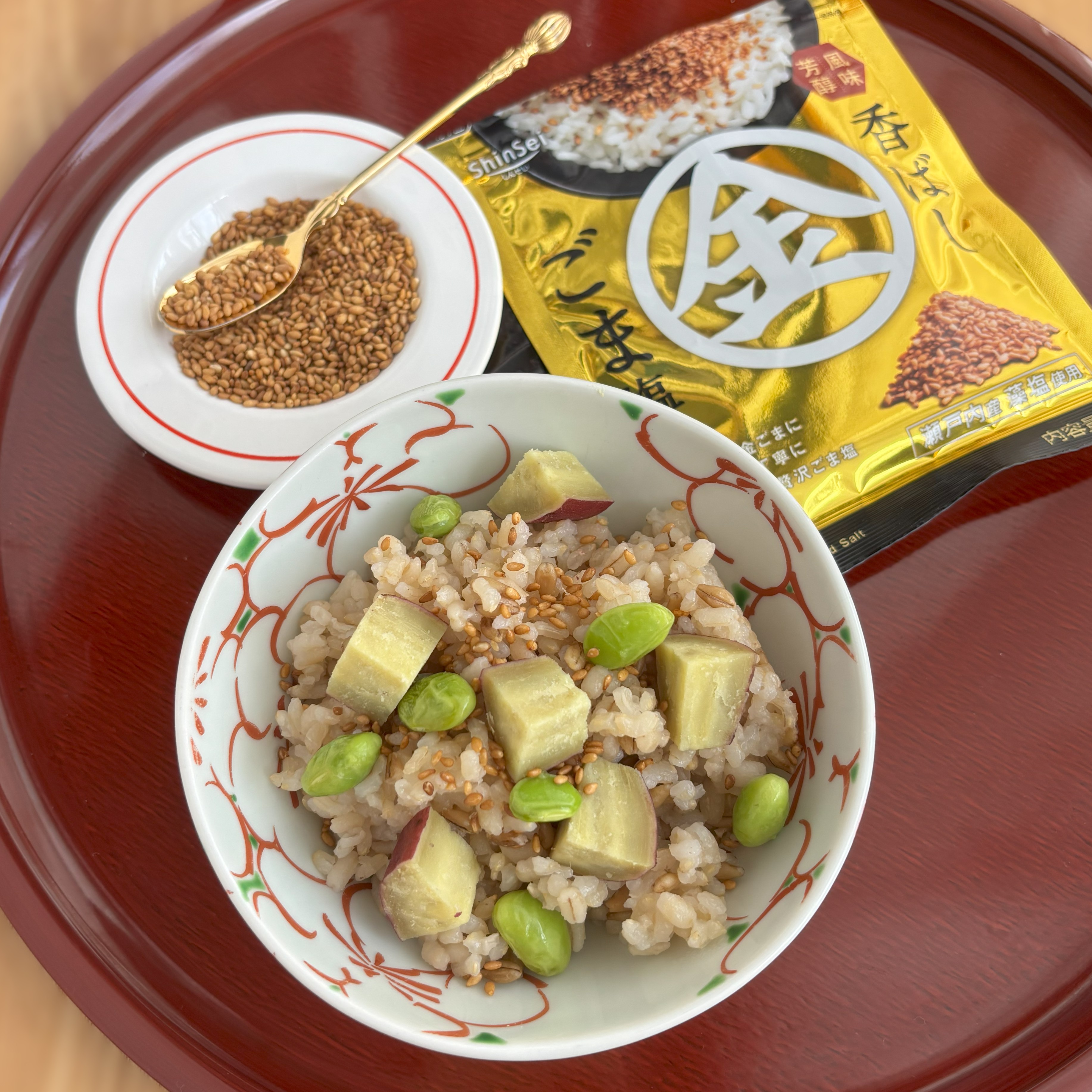 秋、旬のさつまいもがおいしい季節。さつまいもと枝豆のごはんにも金ごま塩をぱらり。