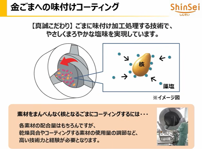 あっさりした黒ごまのごま塩もいいけど、芳醇な香りとピーナッツのようなコクを感じる金ごまを使っているところや、 真誠独自の均一にコーティングする技術でごまに瀬戸内産藻塩を付着させているところ。塩分30%カットだから、マイルドな塩味で、減塩を心がけている人にも嬉しいと思う。