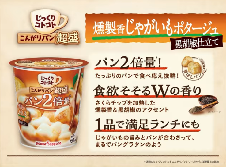今回、紹介いただいた「じっくりコトコトこんがりパン 超盛」シリーズは、ブランド史上最高のパン量(通常シリーズ「じっくりコトコトこんがりパン」の2倍)で、スープというよりもはや「パンが主役」なのでは???スープというより、「パングラタン」に近いのでは???と思うような、軽食としても楽しめそうなカップスープに思いました。