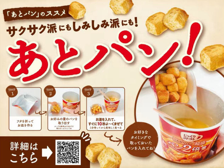 また、パンが2倍量になっていることで、濃厚なスープがじゅわ〜っとしみ込む「しみじゅわ〜!」なパンがたっぷり楽しめるほか、お湯を注ぐ前にパンを取り出し、食べながら追加することでサクサク食感を楽しむ「あとパン」もおすすめの食べ方です。